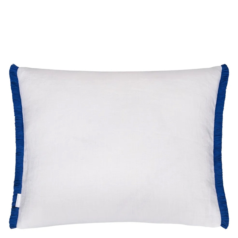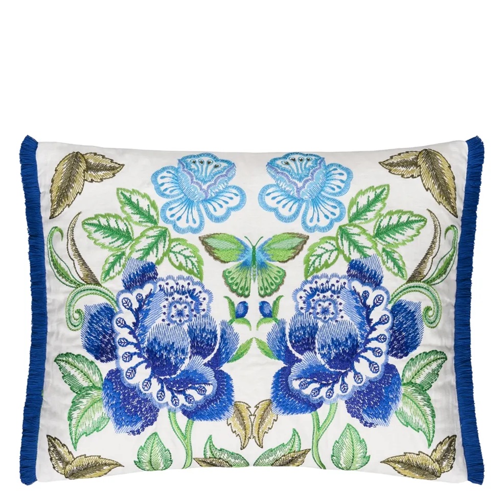 Designers Guild's Isabella Embroidered Cobalt Linen Decorative Pillow is in a dramatic mirrored damask form. This stunning embroidered decorative pillow features large scale floral motifs in cobalt blue, elegantly intertwined with leaves and foliage with a variety of stitch techniques creating intricate detail and dimension. Embroidered onto pure white linen, this contemporary decorative pillow is paired with Tortona on the reverse and completed with a stunning emerald green fringed trimming on two sides. 100% linen. Dry clean only.