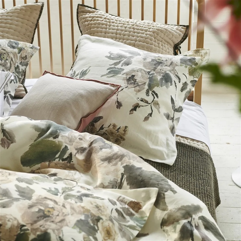 Designers Guild's Shanghai Garden is soft and romantic. It is is adorned with painterly and expressive roses and peonies in soft neutral tones. In a dramatic statement scale, this luxurious floral bedding is digitally printed onto pure linen with a white linen reverse. Shams finished with a smart linen color trim detail. OEKO-TEX Standard 100 approved for added confidence. 100% Linen.