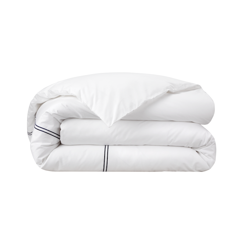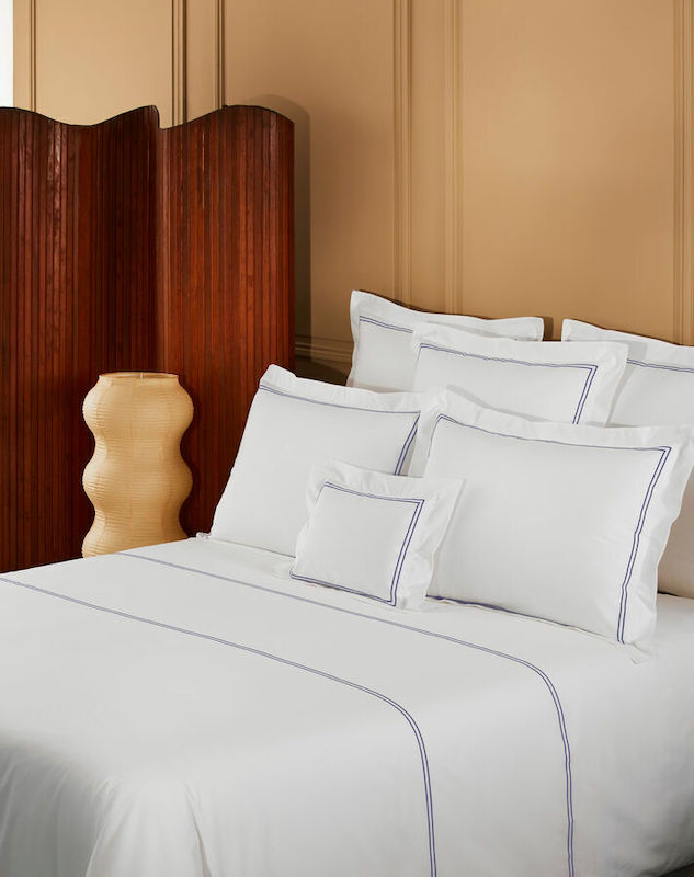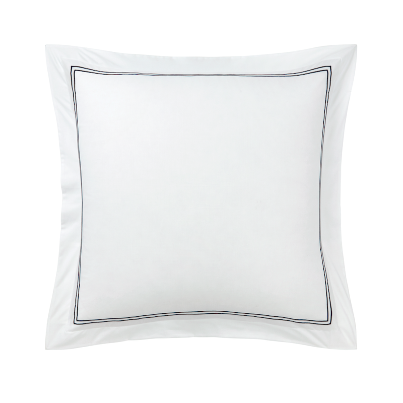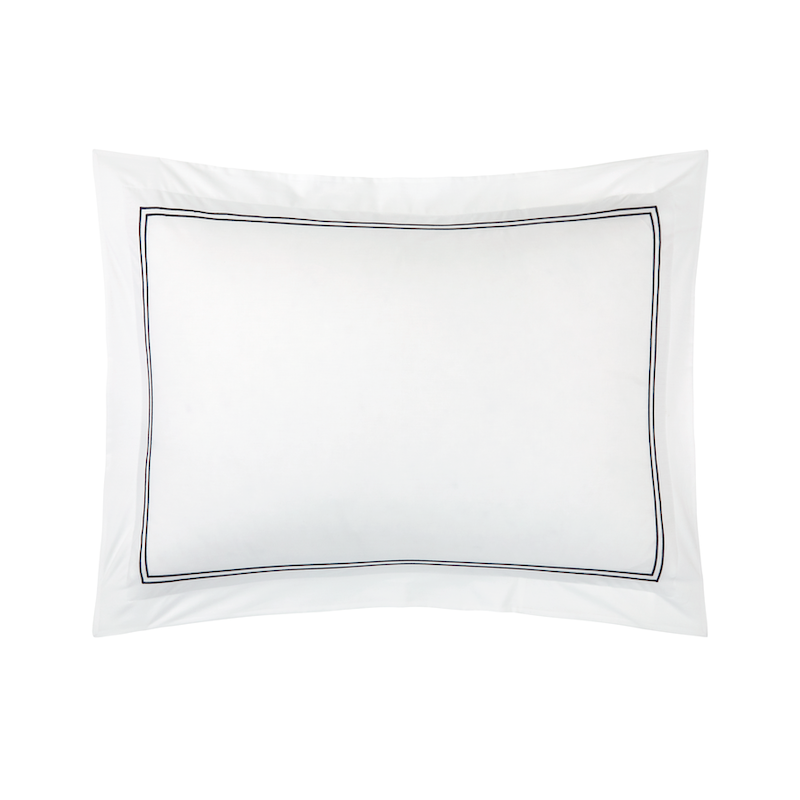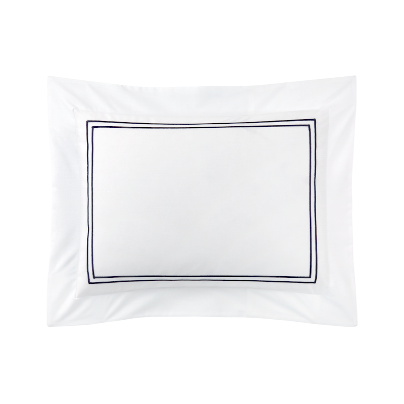Yves Delorme Duo in Marine has double satin-stitch embroidery on white percale. The crisp, fresh and matte feeling of percale highlights the luster of the colored embroidery. 100% long staple combed cotton, 200 thread count. Made in France.