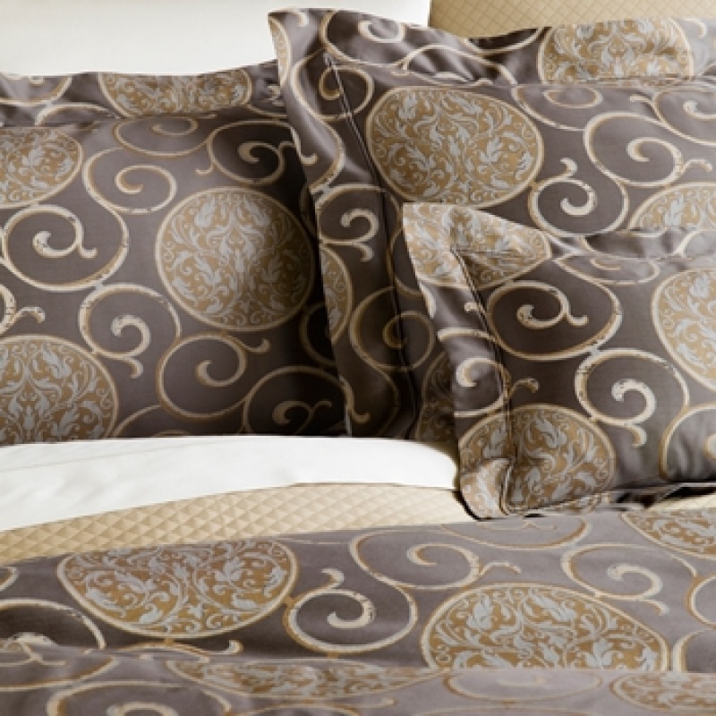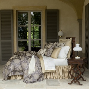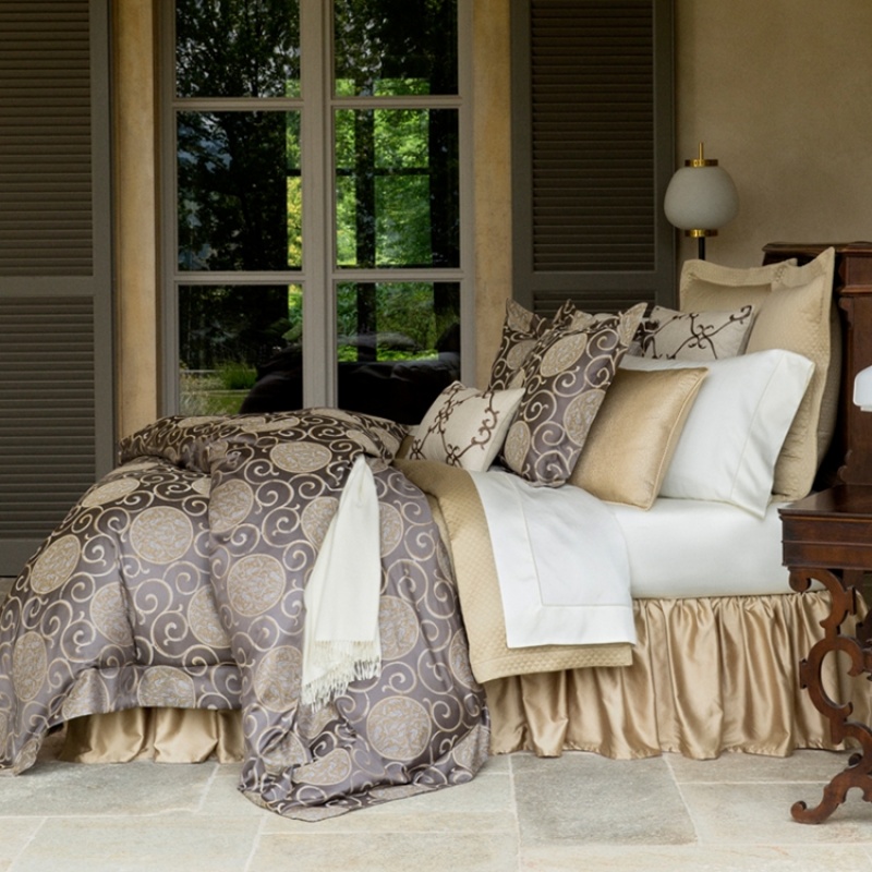With its elegant, courtly medallion pattern, Tarsia's design pedigree draws upon a tradition of textile motifs which date back more than a millennia and appear in every corner of the globe. With such noble origins, one might behold our majestic Italian-made sateen jacquard with renewed esteem. Crafted in harmonious tones of slate, gold and silver, Tarsia is expertly woven by our textile masters using individually dyed yarns to depict its referential coin-like pattern. It's emblematic of a taste for all that is refined and precious, offering an interior decorator look for a master bedroom with style and panache. Finished with a punto ombre hem treatment.