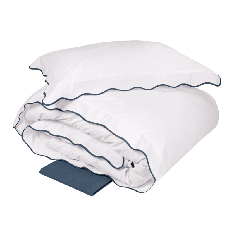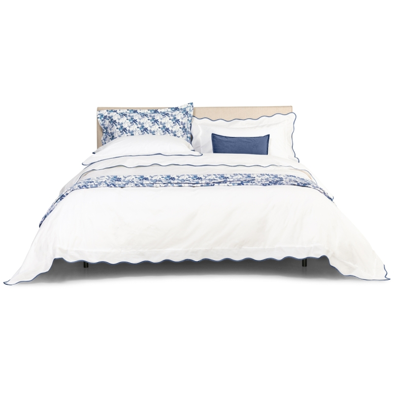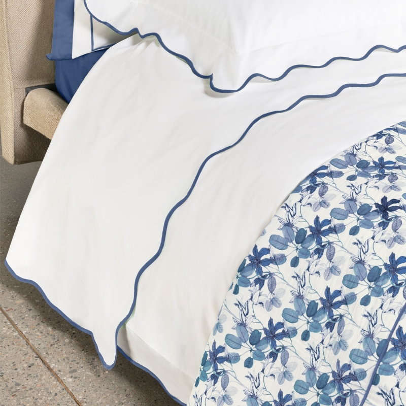 Fazzini's Navigli refers to summer and the world of yachting and its refined elegance. A wavy frame, which evokes the gentle movement of water, embellishes the white of this collection. The festoon that finishes the pillowcases returns to the profile of the duvet cover. The complex application of this detail and the preciousness of the large mother-of-pearl buttons celebrate the excellence of Italian manufacturing. Duvet cover with three flounces, pillowcases with four flounces and flat sheet. Prestigious Angel Skin percale - Pure 250TC Pima cotton with bias applied in waves. Made in Italy.