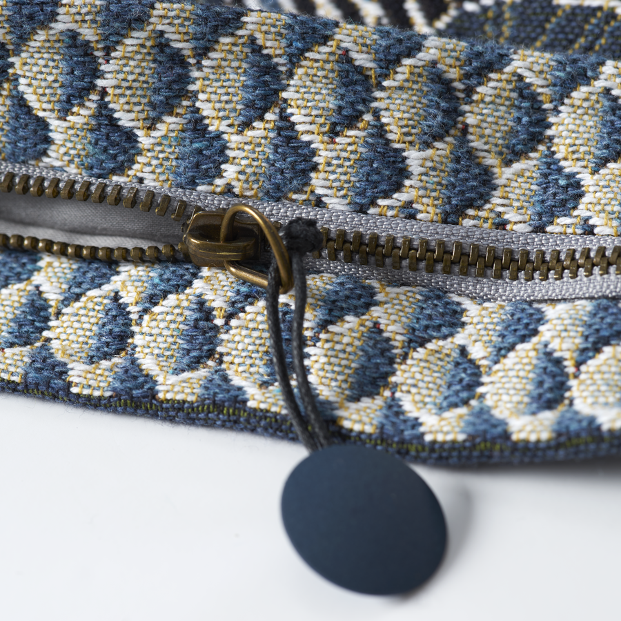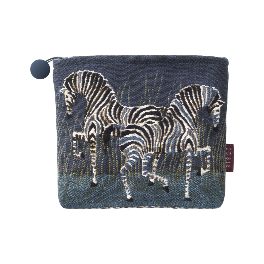 Iosis' Fifty Fifty Totehas a pair of elegant and thoroughbred zebras. Their striped profiles stand out against a setting of the long grasses of Savannah. Available in Nuit, Sunset and Celadon color ways. Matching decorativepillows also available. Cotton tapestry woven in Belgium. Zipper closure, 6 in x 8 in.