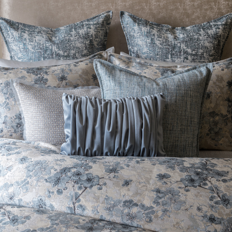 in Gold/Silver or Blue. Shams are self backed and have a 1/2" flange. 82% polyester and 42% cotton.
