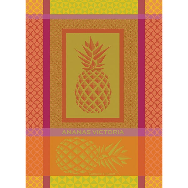 Garnier Thiebaut's Ananas Victoria Samba is bright and extremely cheerful. The Pineapple for many is the symbol for friendship and hospitality. The colors are like sunshine . Add a hint of French style in your kitchen. 100% cotton jacquard woven. Made in France.