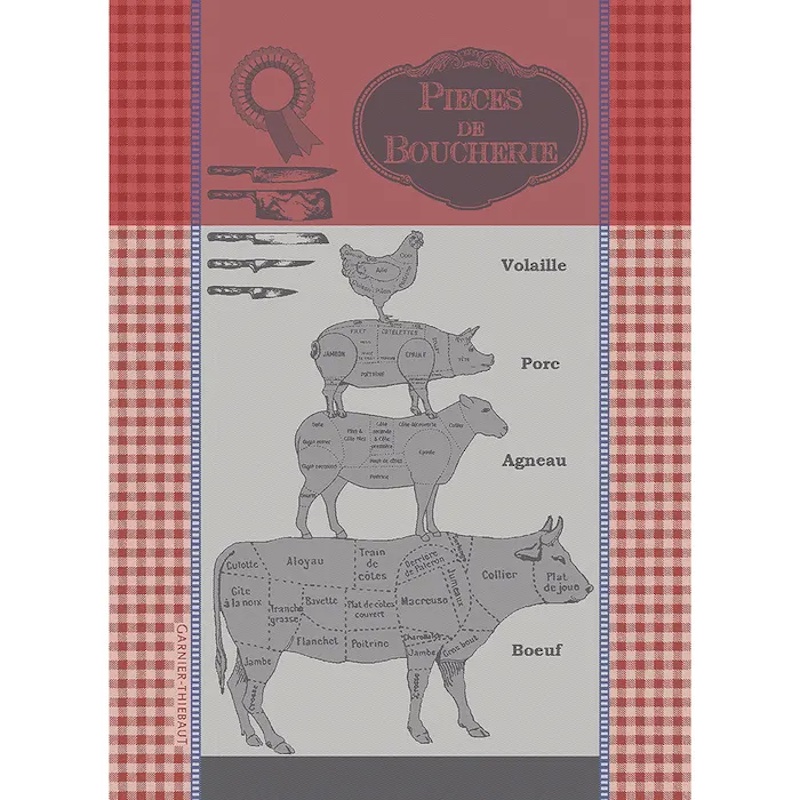 Garnier Thiebaut's Piece De Boucherie Rouge depicts the butchers cuts. This would be a perfect gift for anyone who enjoys grilling meats. I am thinking Father's Day Gift! Add a hint of French style in your kitchen. Hook label. 100% cotton, printed. This premium quality of cotton with long fibers results in a stronger, softer and more durable fabric. Made in France.