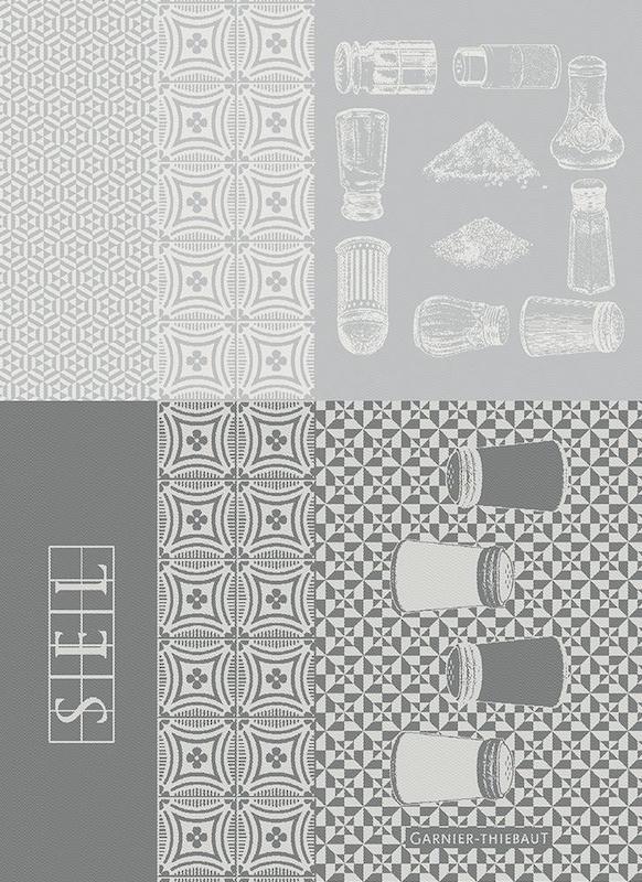 Garnier Thiebaut's Salieres Blanc Tea Towel is more of a tone on tone rather than the usual GT colorful explosion. With elegant tile patterns and different shapes of Salt shakers this towel is elegant and practical looking. The towel is woven in grey tones. 100% cotton jacquard woven in France.