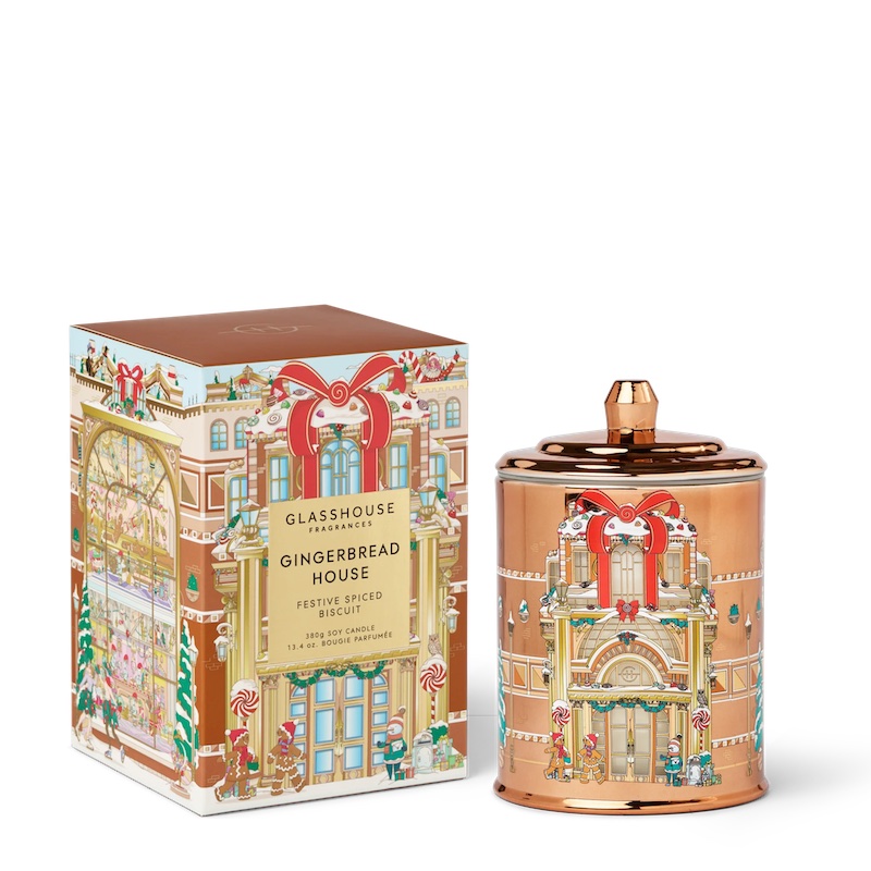 Glasshouse Fragrances' Gingerbread House 2025 Limited Edition Candle comes in a decorative vessel with illustrations by Aeoniumsky, that brings the magic of the festive season.