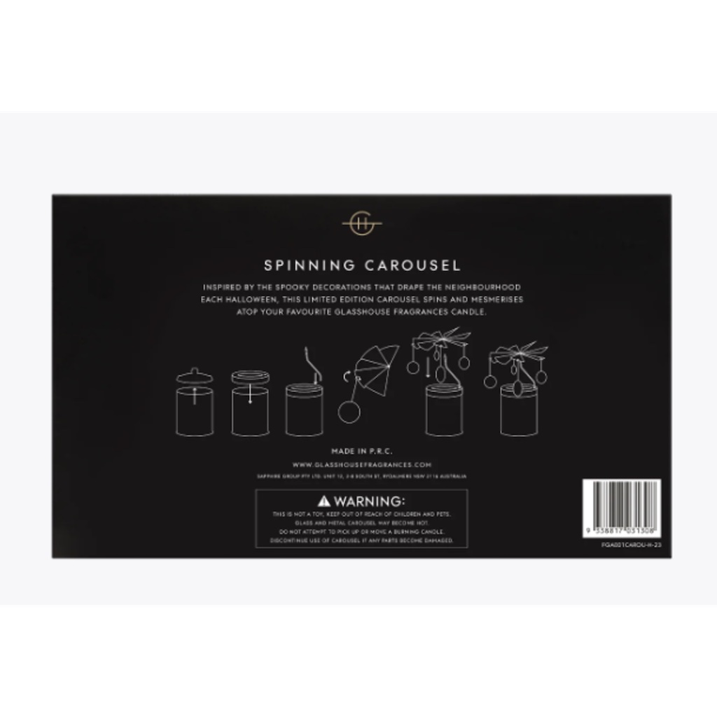 Glasshouse Fragrances' Halloween Spinning Carousel Accessory was inspired by the spooky decorations that drape the neighborhood each Halloween, this limited edition carousel spins and mesmerizes atop your favorite Glasshouse Fragrances candle.