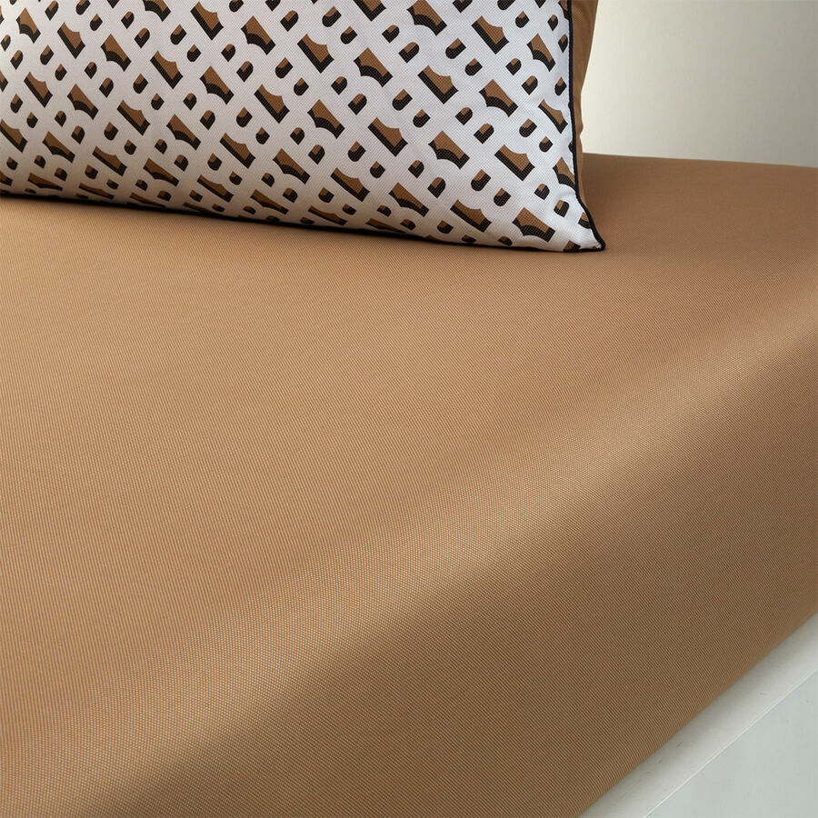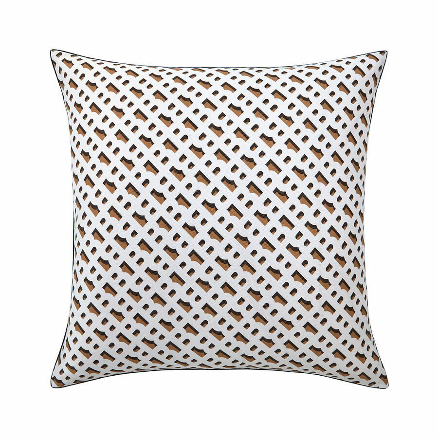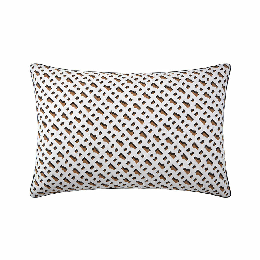 Designed by Hugo Boss and produced by the Yves Delorme Fremaux Family. B Monogram is printed on cotton sateen. Hugo Boss' iconic pattern and colors stand out with conviction in this collection. It is lined with a camel micro-pattern on the reverse. The pillowcases are bordered with black piping. A quilted bedspread, as well as quilted pillow shams are also available to complete the look. Duvet cover and shams have a zipper closure. Printed on 300 tc cotton sateen.