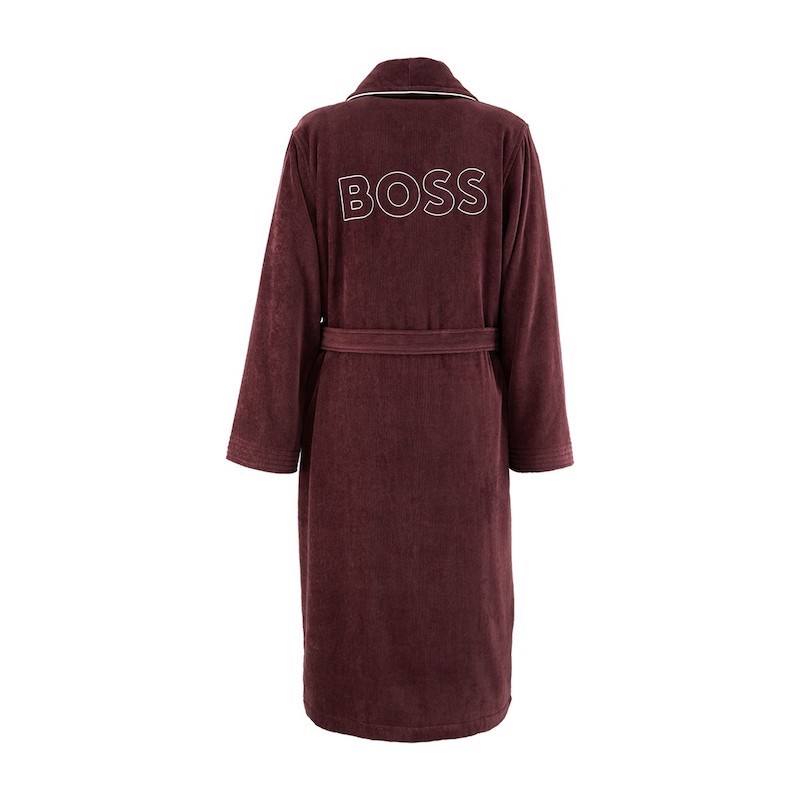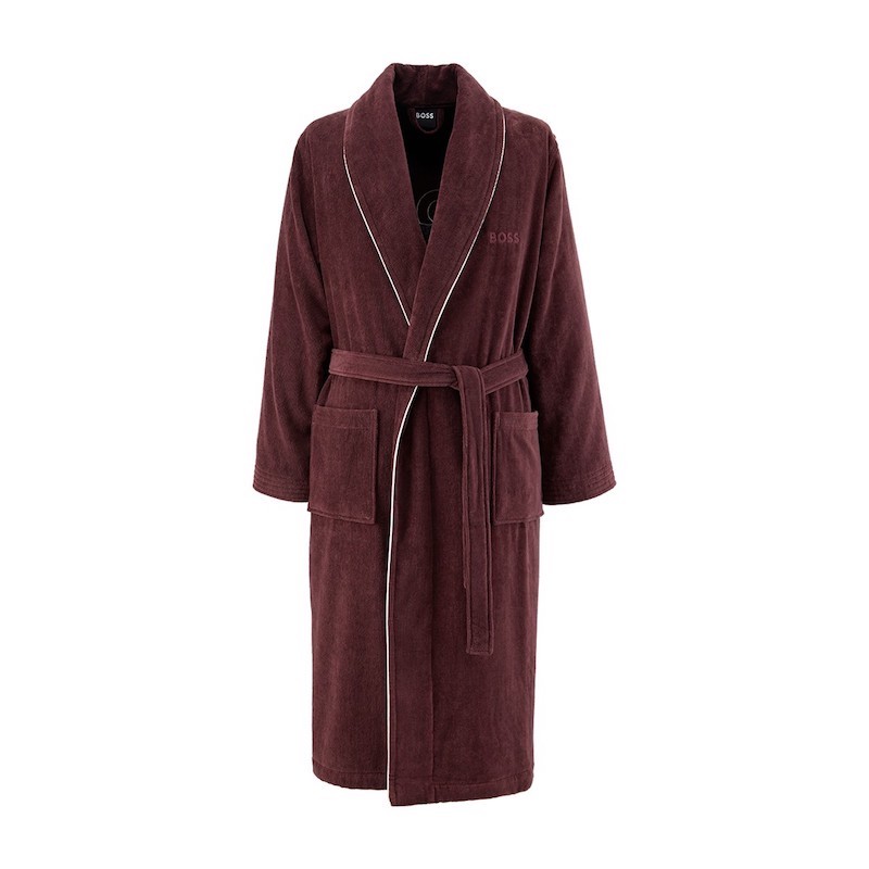 This luxurious men's bathrobe showcases Hugo Boss craftsmanship with its distinctive logo embroidery adorning the back. Crafted from premium cotton velvet with a plush 430 gsm weight, the interior features soft terry for enhanced comfort. The sophisticated shawl collar and contrasting camel piping along the front create refined detailing, while functional side patch pockets and an adjustable tie belt offer practicality. The velvet finish delivers a sumptuous feel against the skin, making this 100% cotton piece an elevated choice for elevated loungewear.