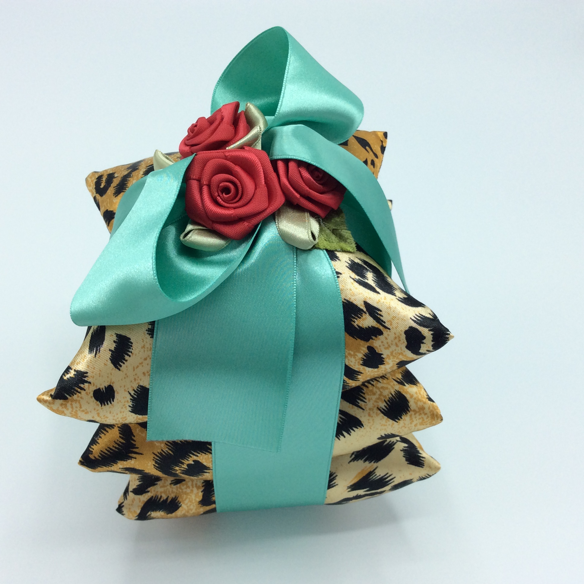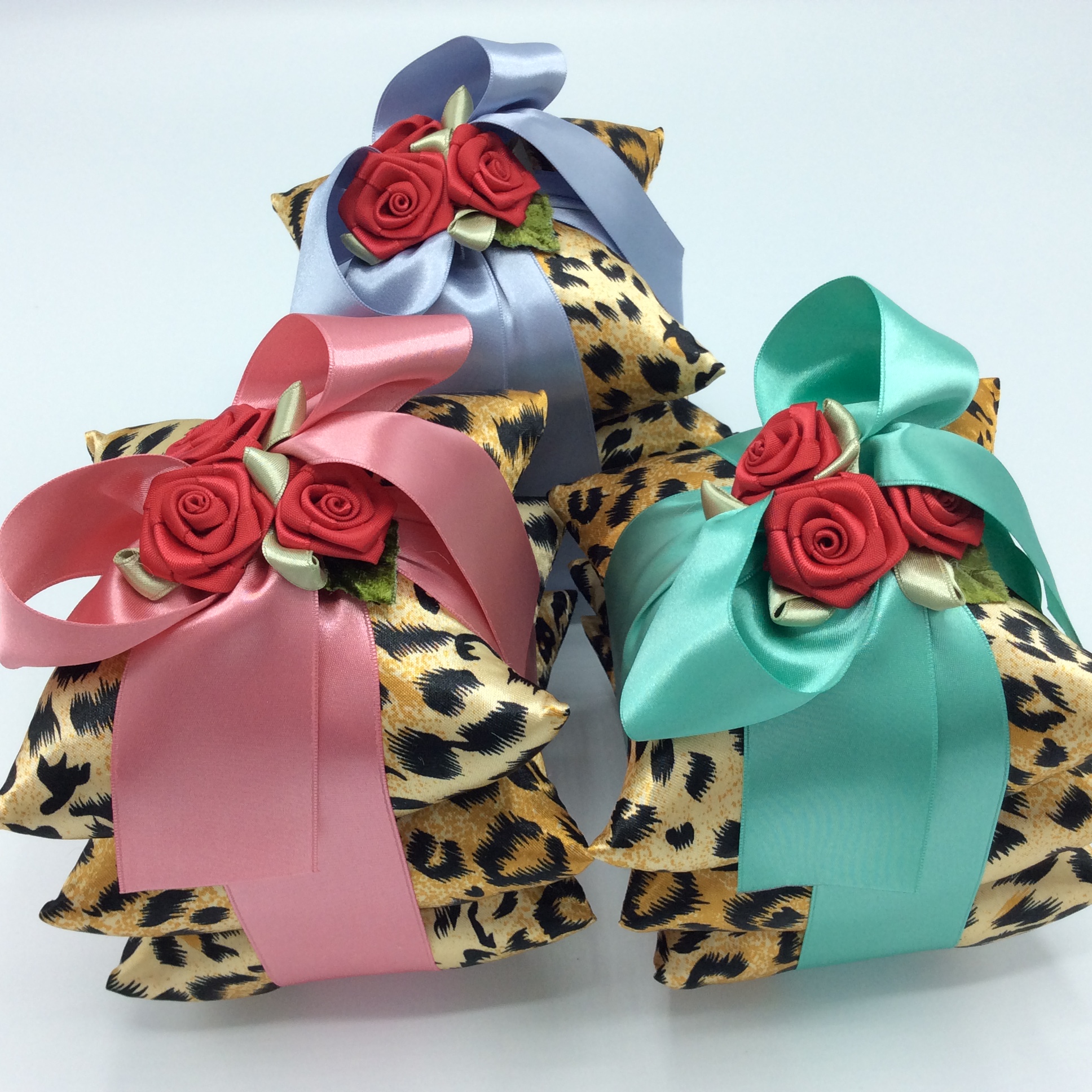 A stack of three silk pillow sachets tied with a beautiful french blue ribbon and topped with three red silk rosettes -- from Irene Hirose. Beautiful presentation and a very scented for the drawer. Filled with Irene Hirose's signature scent.