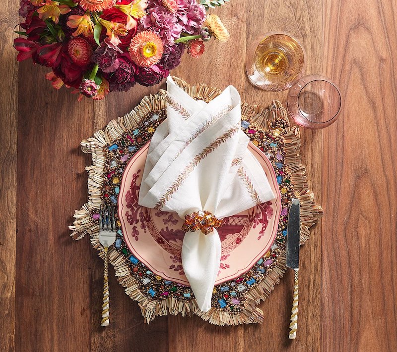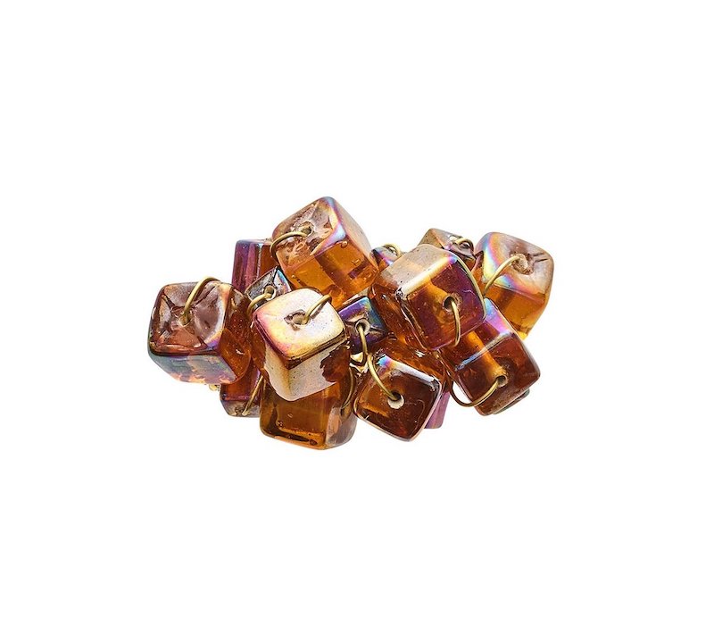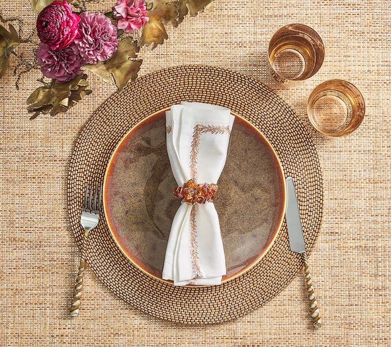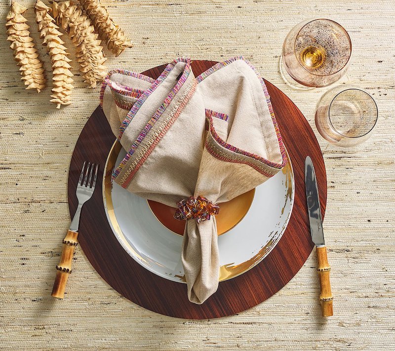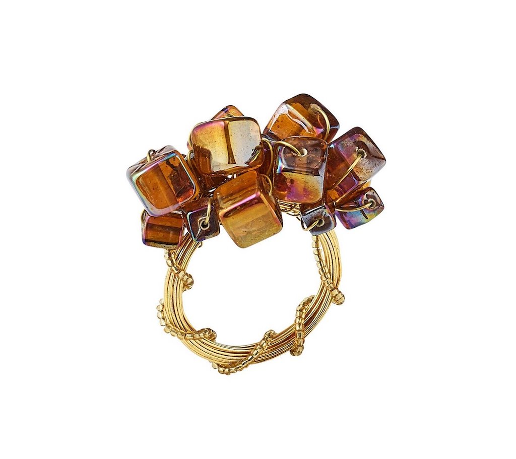 Kim Seybert's Array napkin rings are pure sophistication and elegance. They are composed of amber square beads of gold and amber. The iridescent cubical amber beads are clustered together on a gold wire ring. The amber tone and shimmer of this napkin ring make it a perfect choice for fall and Thanksgiving entertaining. 95% glass beads, 5% metal.