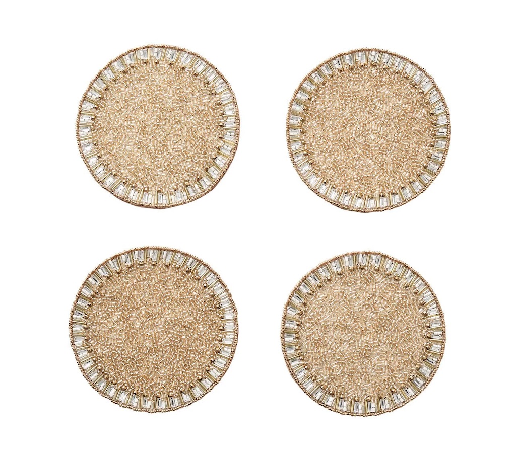 Kim Seybert's Bevel Coasters give a nod to baguette stones typically found on jewelry, the round Bevel Coasters exude an understated grace. To create a halo effect, glass, and acrylic beads in champagne, gold, and silver are carefully arranged in a pavé pattern. 80% Glass Beads, 20% Plastic Beads on 100% Cotton Backing. 4.5" Length x 4.5" Width x 0.25" Height.