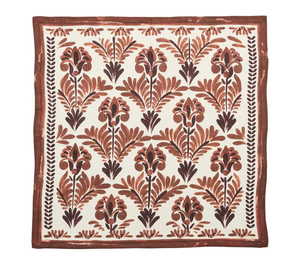 Adorn your fall table with the Botanica Napkin, from Kim Seybert, showcasing a harvest-inspired pattern in rich brown and gold colors. Hand-painted leaves, flowers and abstract shapes are digitally printed on linen, creating a playful and vibrant autumn design. This napkin adds the right amount of energy to your fall table setting, infusing it with a delightful touch of seasonal charm. 100% linen. Sold in sets of four. Shown with the wood matrix placemat and the Botanica napkin ring.