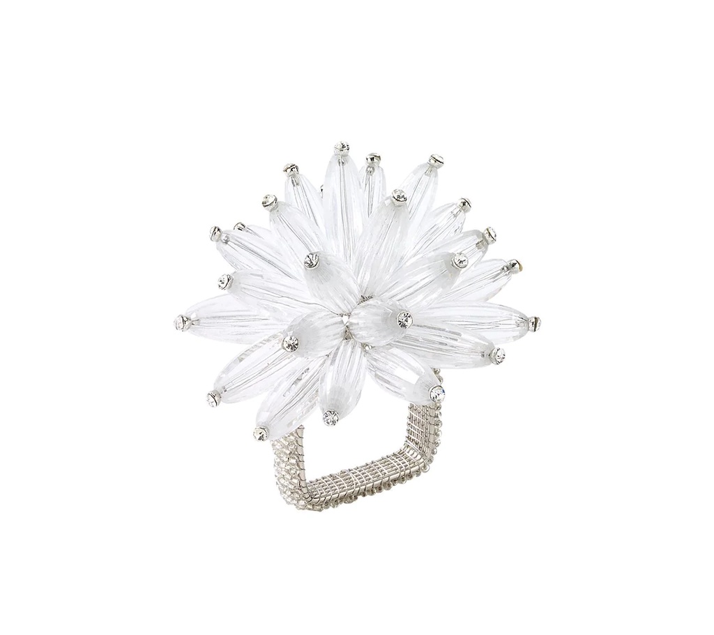 Kim Seybert's Constellation Napkin Rings feature a celestial arrangement of silver colored acrylic and glass beads. Oblong shaped silver beads are capped with crystal orbs on this beaded napkin ring, mimicking ethereal stars. A square shaped ring is covered with petite silver beads to complete this elegant napkin ring.