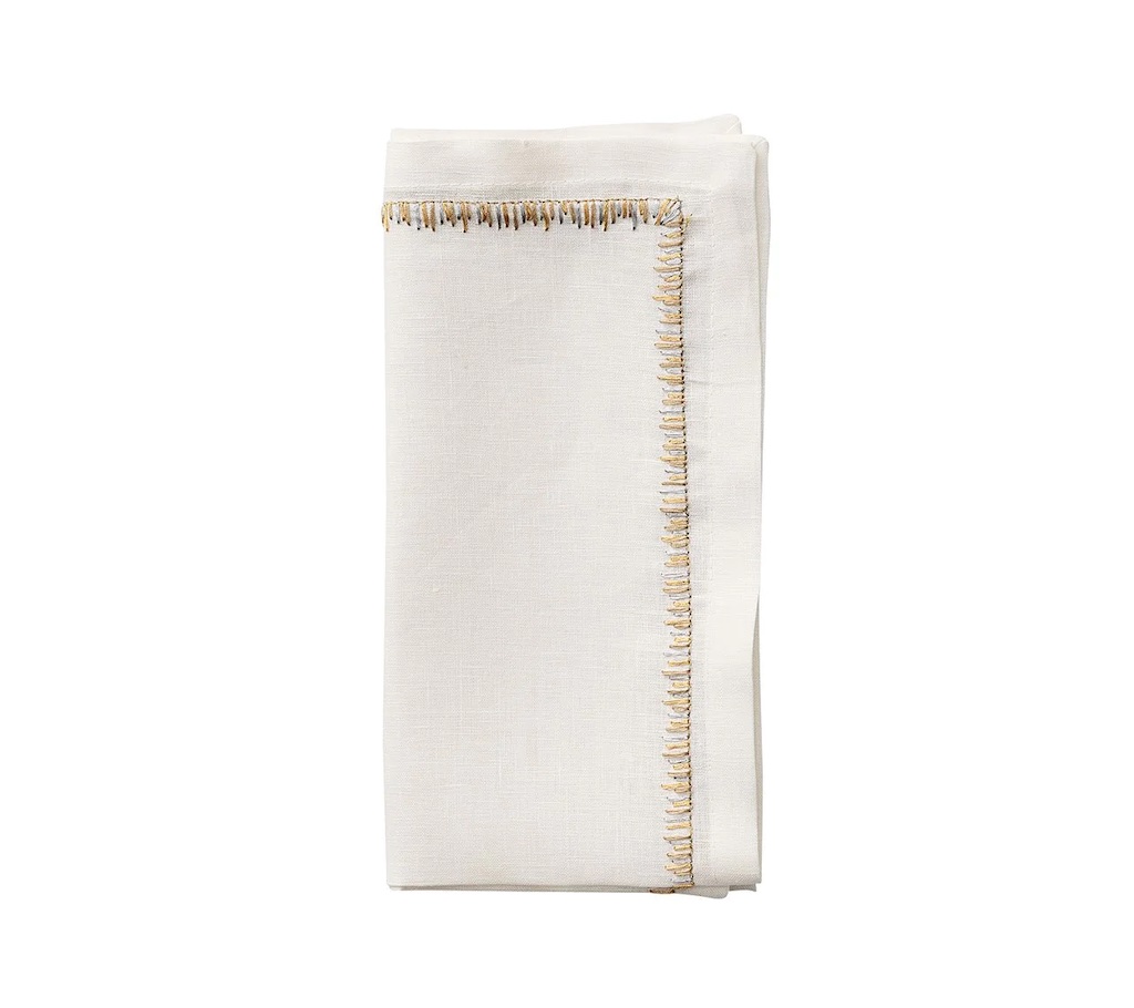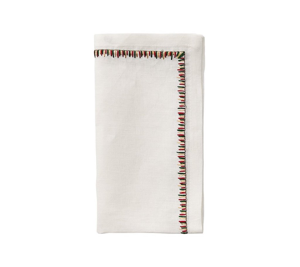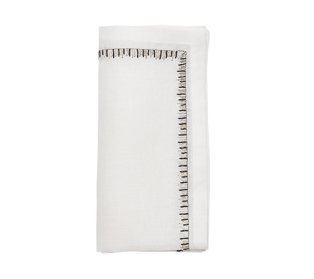 Kim Seybert's Filament Napkin is defined by long, embroidered stitching along the edge. The stitches contrast against the white linen napkin similarly to the way the bright light contrasts against the frosted glass.  100% linen