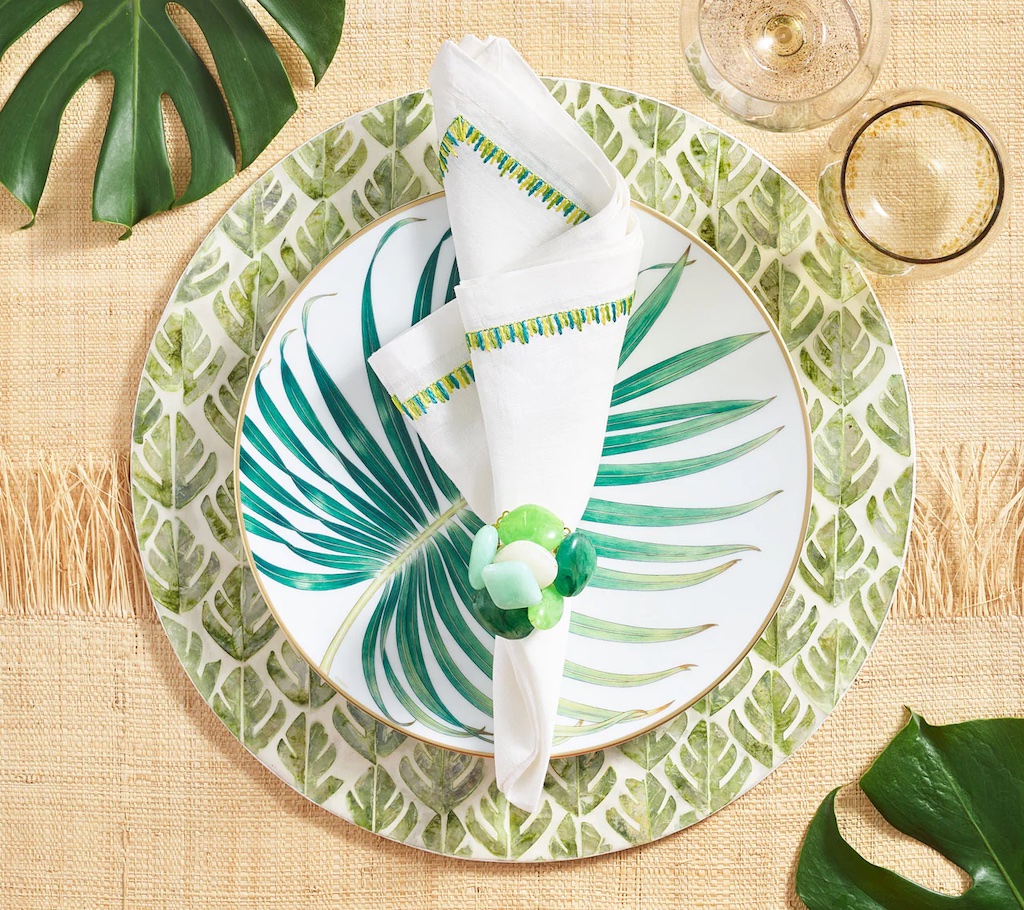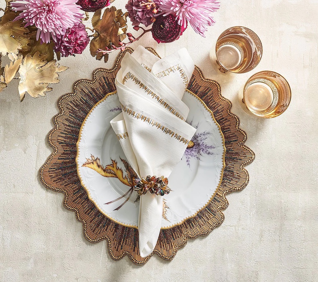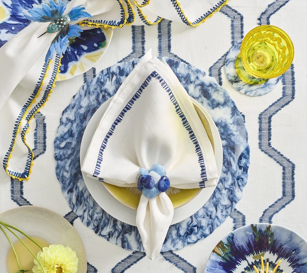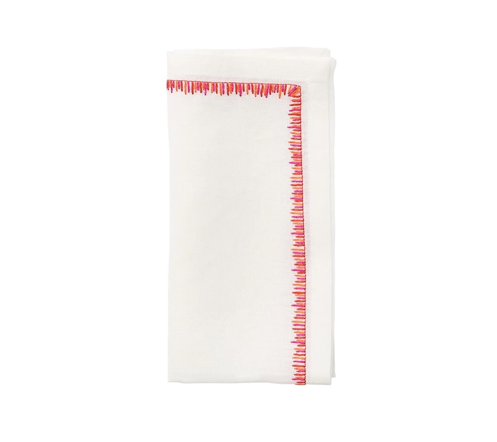 Kim Seybert's Filament Napkin is defined by long, embroidered stitching along the edge. The stitches contrast against the white linen napkin similarly to the way the bright light contrasts against the frosted glass.  100% linen