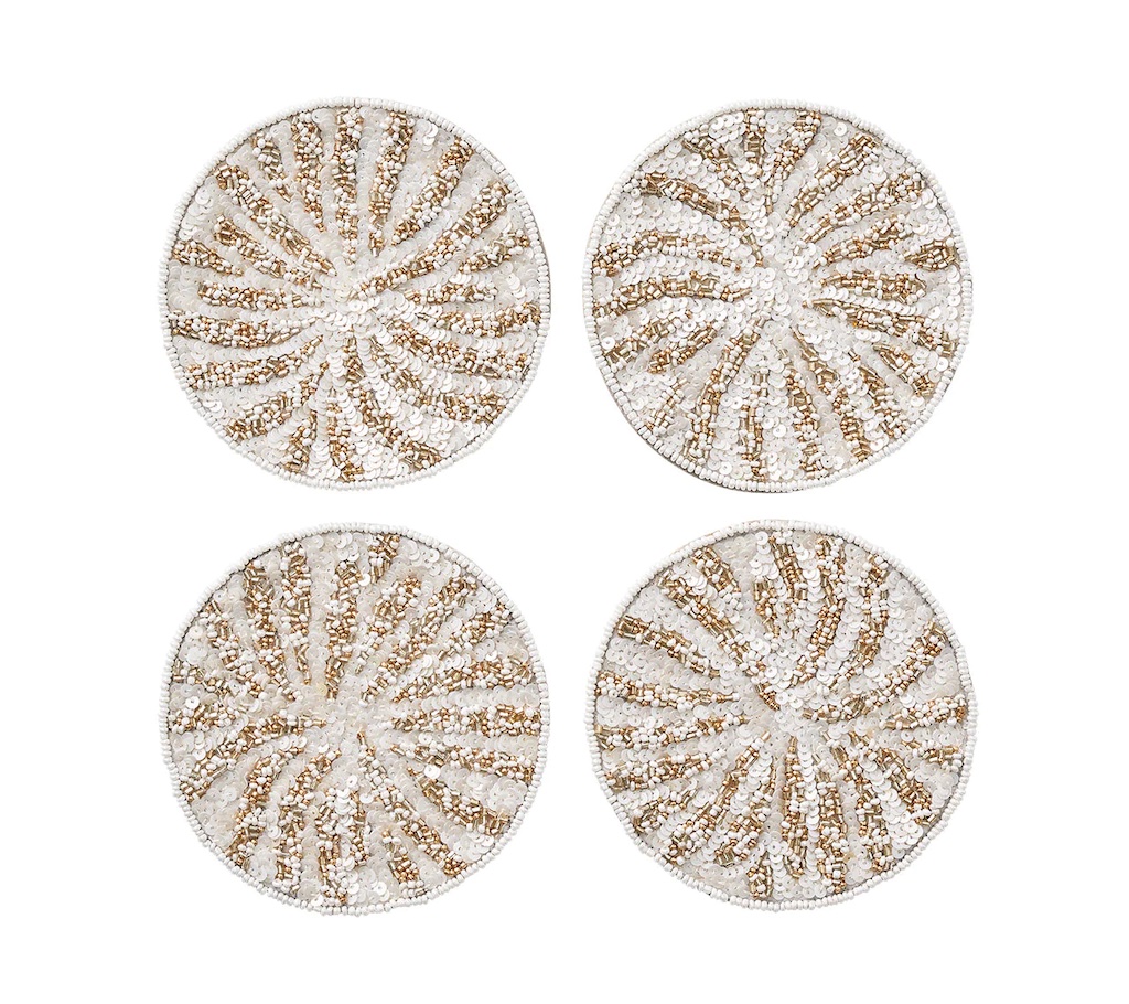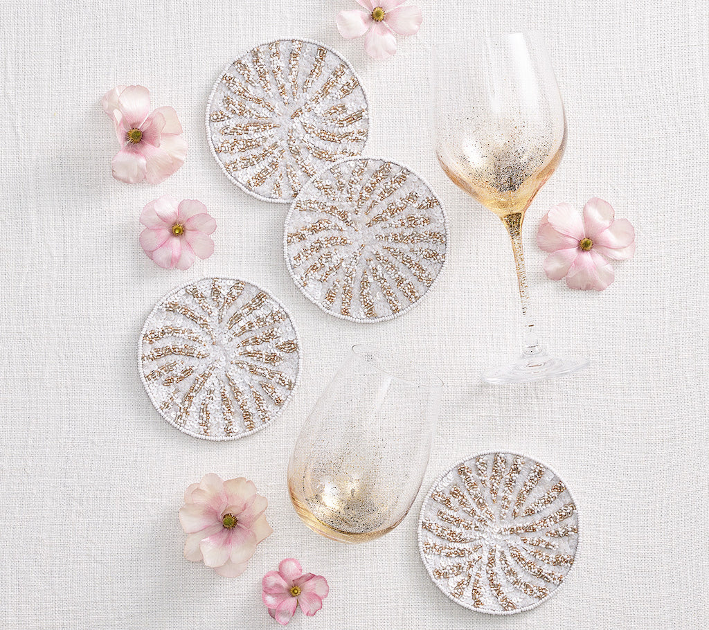 Kim Seybert's Fireworks Coasters are transitional in style. They get their design inspiration from the fun and festive celebratory sparks that are often seen lighting up the sky in the summer. Made with silver and gold beads, these round coasters are more than just a protective barrier against condensation and spills. They are a design statement. The unique radiating sparks are created by using a crunch-beading technique, giving the beaded coasters that "wow” factor. Perfect as a hostess gift or for your own home. 65% Glass Beads, 35% Plastic Beads on 100% Cotton Backing.