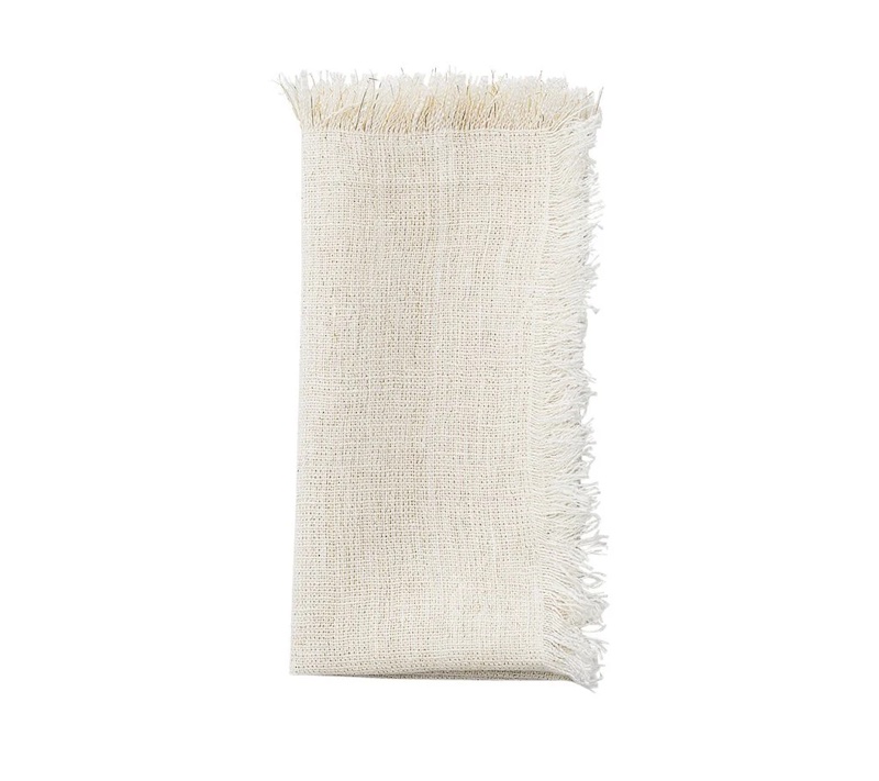 Kim Sybert's Fringe Tablecloth is a glamorous take on farmhouse chic. Gold lurex is woven with white linen -- creating an elevated shimmer. Available in one size -- 50 x 110. Also come in natural colored linen with silver lurex. 99% linen/1% lurex. Matching napkins available.