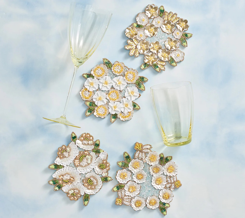 Kim Seybert's Gardenia Coasters were inspired by blooming flowers and the clear blue spring sky. Sequins and beads come together using a three-dimensional layering technique to create yellow and white flowers that are hand-folded into four different bouquets. The cocktail coasters are a fun "pick” for a garden party, brunch or hostess gift. 55% Plastic Beads, 45% Glass Beads on 100% Cotton Backing.