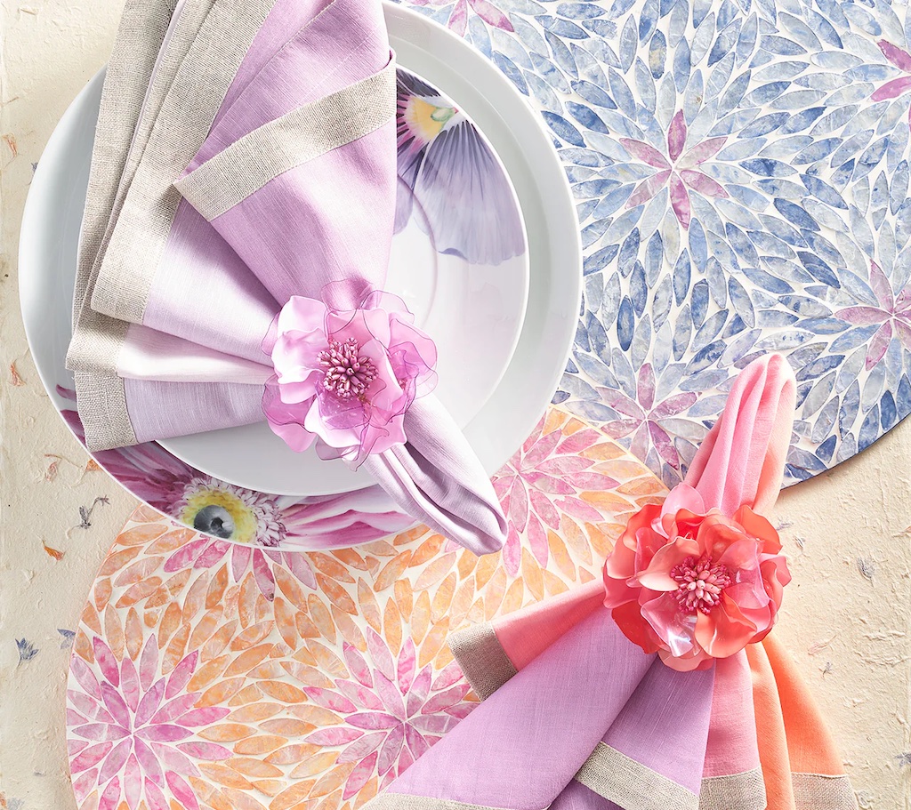 Kim Seybert's Gardenia Napkin Ring in Lilac depicts the beautiful purple blossom in full bloom. Molded by hand, lilac-colored sequins form individual petals on a metal napkin ring base. The delicate petals are then hand-layered to create a realistic bloom. The lifelike flower sits atop the beaded base of the napkin ring. 70% Plastic Beads, 15% Glass Beads, 15% Metal Base. 4" Length x 4" Width x 3.25" Height.