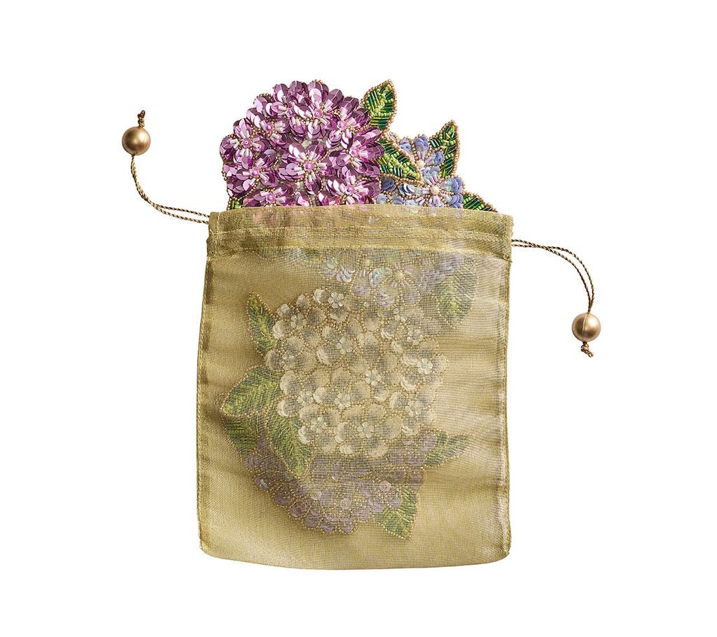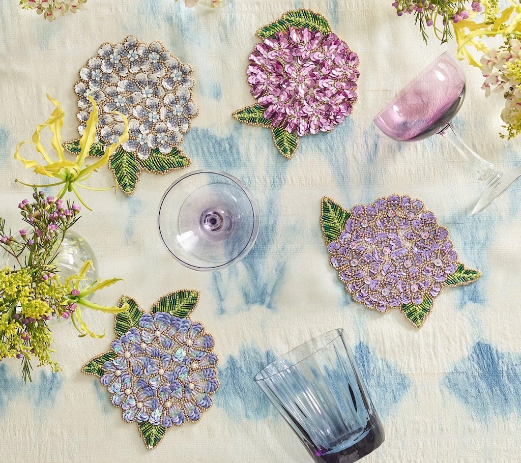 Kim Seybert's Hydrangea Coasters feature sequined realistic and fantastical hydrangea, inspired by Kim’s Hamptons garden. A unique layering beading technique is applied to achieve the ombre, fluid quality of the petals on these coasters. A set of four different hydrangea blooms are created by hand using 20-30 different types of sequins and beads. 50% Glass Beads, 50% Plastic Beads On 100% Cotton Backing. 5.25" x 4.5" x 0.2".