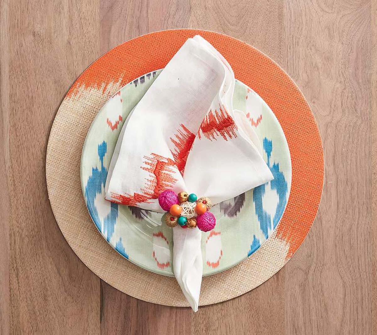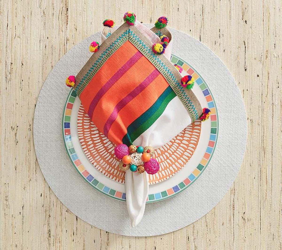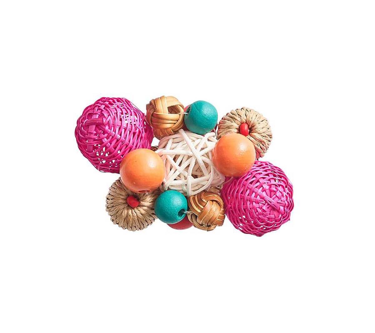 The textured Java Napkin Ring features mini woven balls in natural materials and vibrant colors displayed in a cluster atop a wooden base. Seven different types of rattan and wooden beads are polished, painted or woven by hand to create the bead-like baubles on this festive napkin ring. This exceptional napkin ring is hand-made using naturally occurring materials, variations are to be expected. Measures 3 x 2.75 x 2. Color shown: multi.