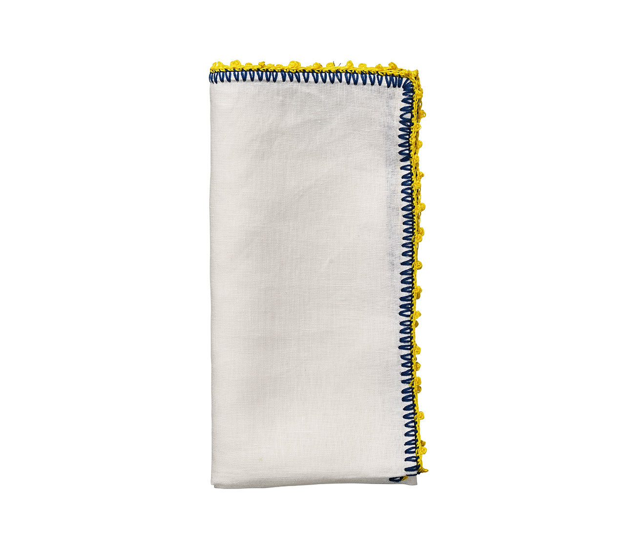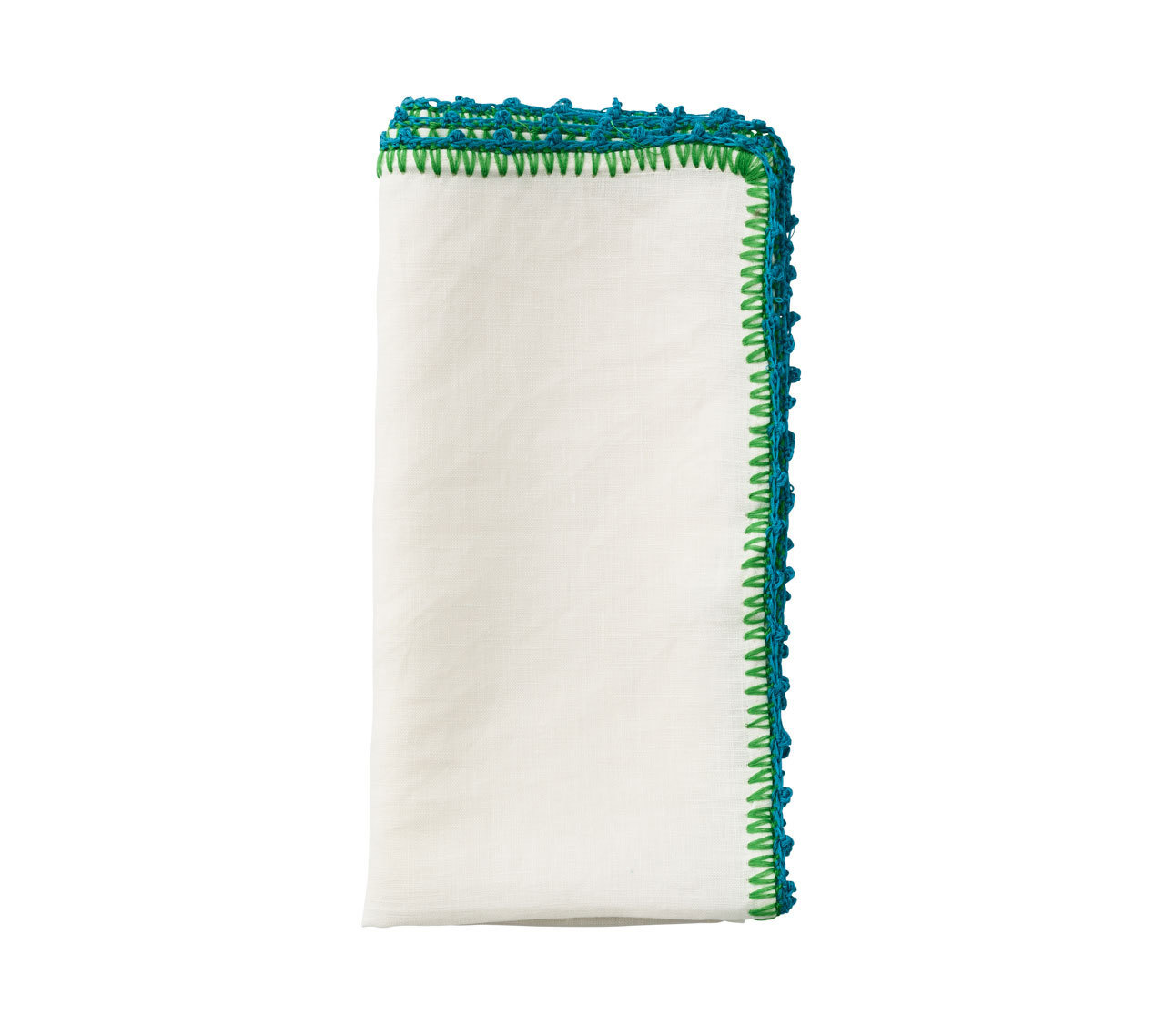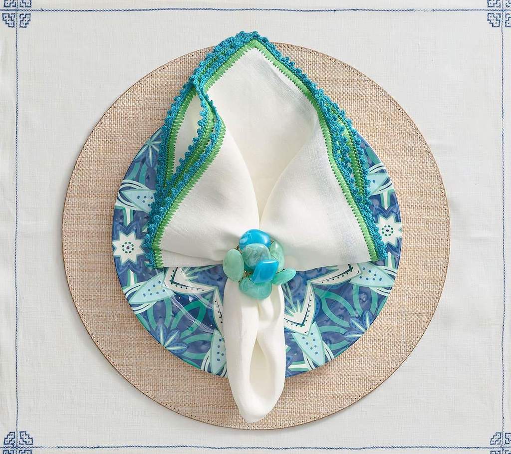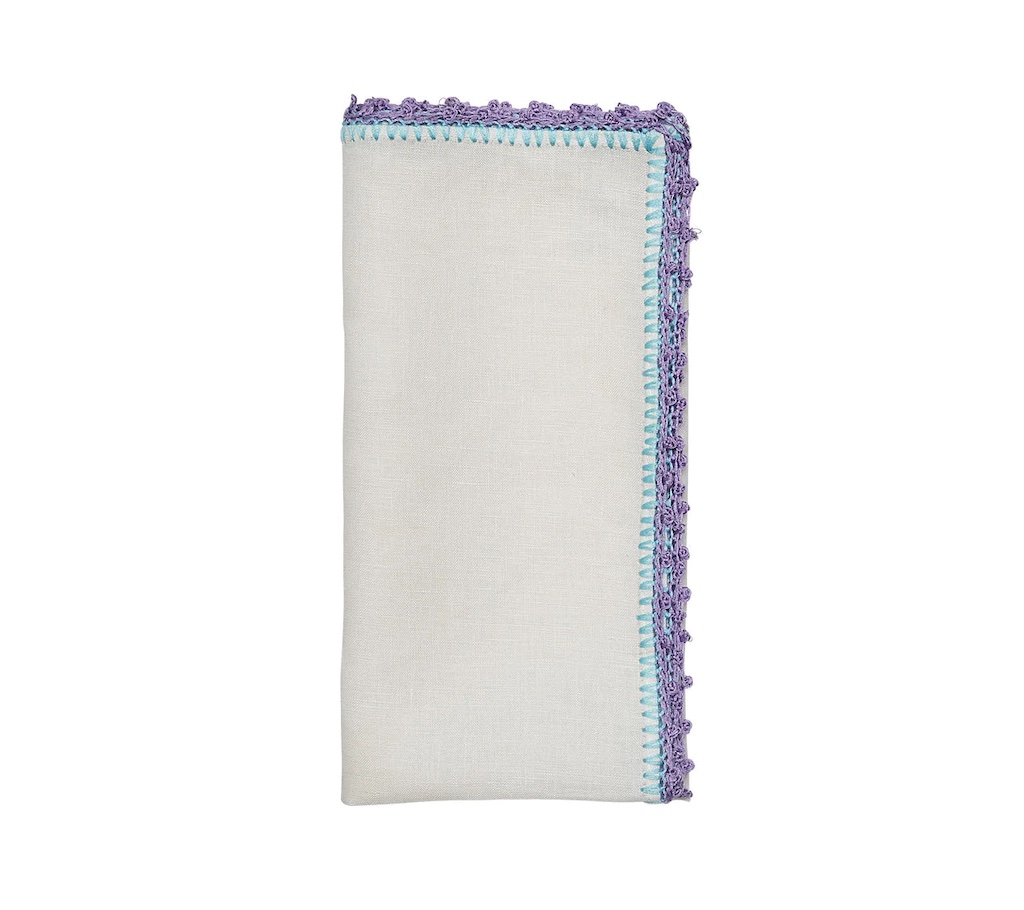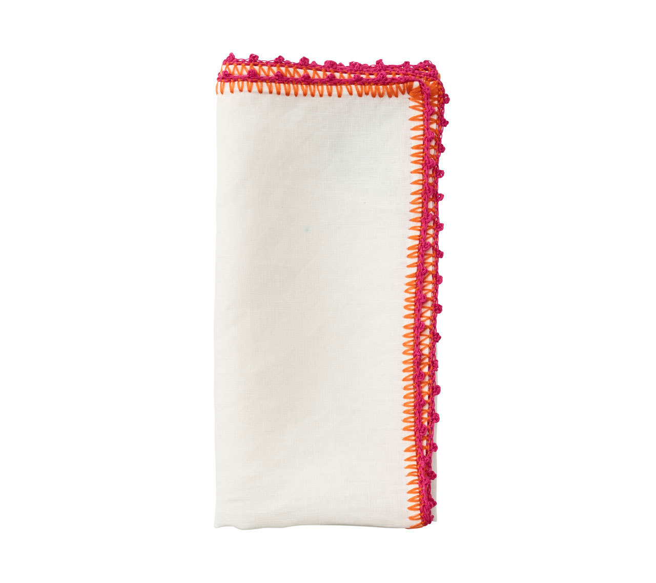Kim Seybert's Knotted Napkin will sure make for a lively addition to your table, what with its two-tone hand crocheted edging in vibrant combinations. Its white linen body all the more brings the eye to the colorful trim. 100% Linen