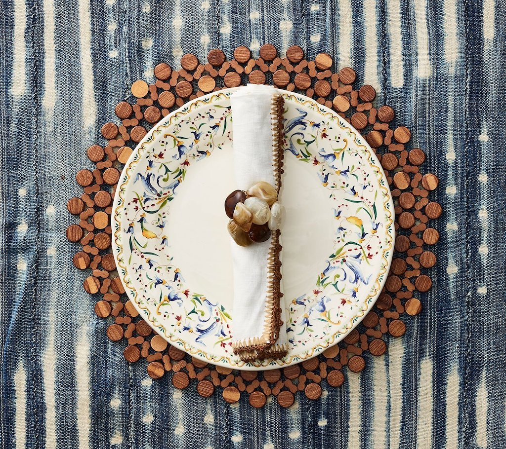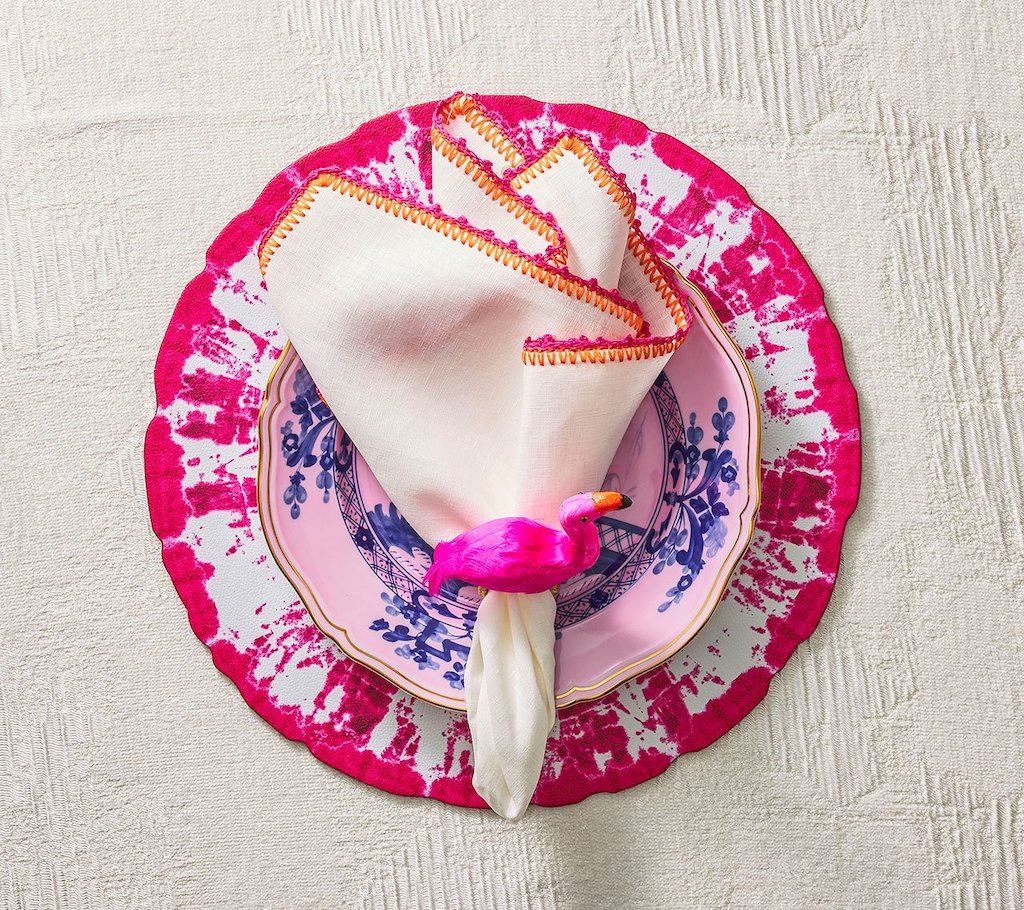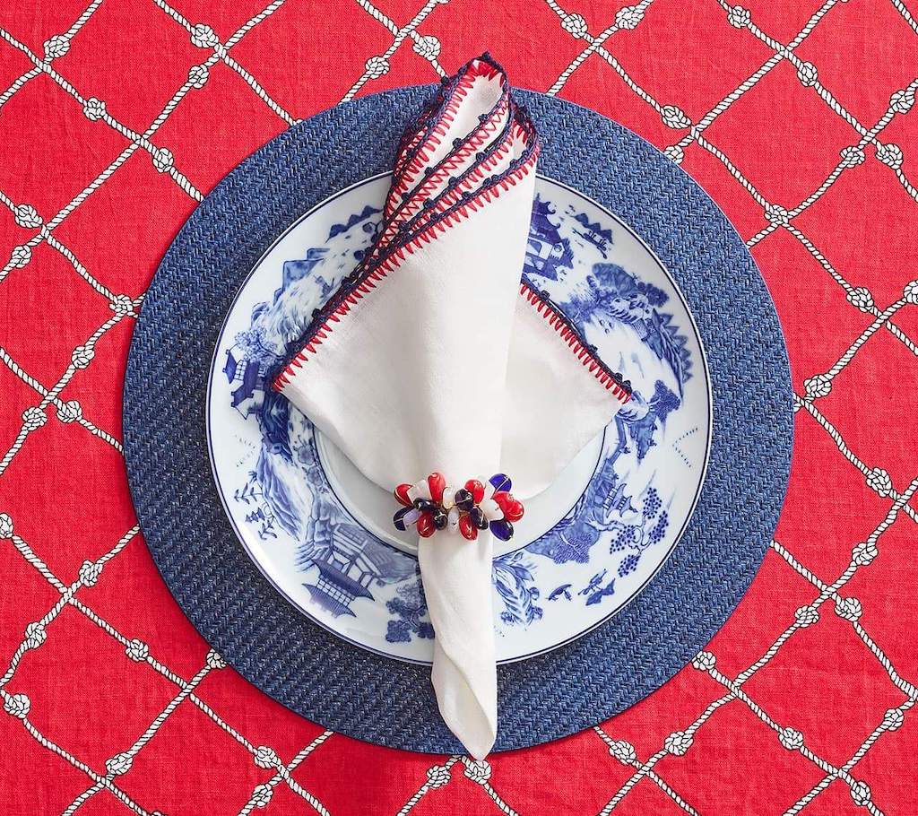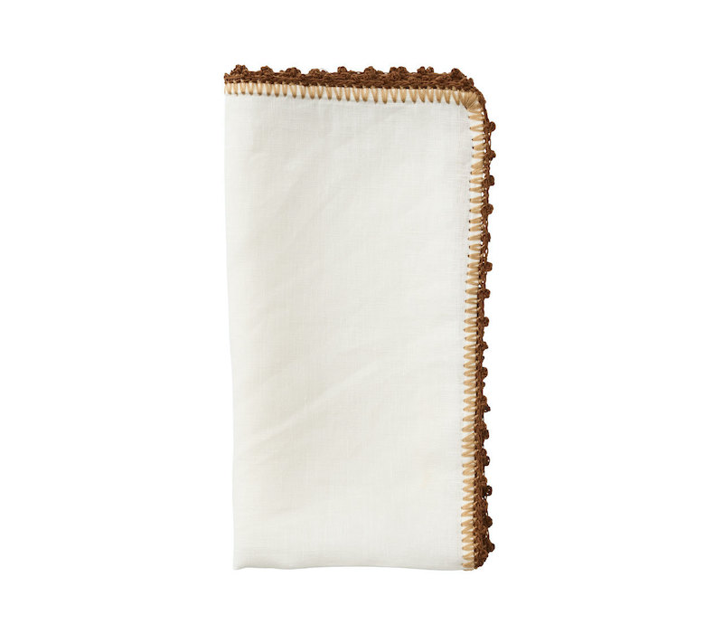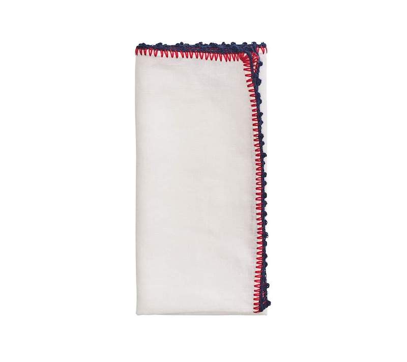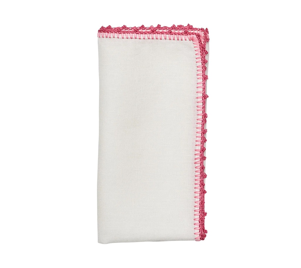 Kim Seybert's Knotted Napkin will sure make for a lively addition to your table, what with its two-tone hand crocheted edging in vibrant combinations. Its white linen body all the more brings the eye to the colorful trim. 100% Linen