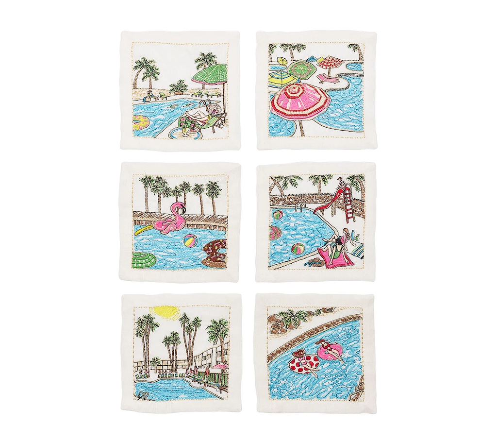 Kim Seybert's Pool Day Cocktail Napkins in White & Multi capture a never-ending summer vibe with these poolside cocktail napkins, which will bring sunshine to your gatherings. The Pool Day linen cocktail napkin features a hand-drawn lively and vibrant pool scene. These embroidered cocktail napkins exude style while embracing the relaxed charm of poolside entertaining. They are perfect for relaxing summer days. offer a contemporary update to the standard white cocktail napkin, featuring a thick embroidered geometric edge accented by delicate pick-stitching. This harmonious border beautifully frames the entire linen napkin. Gold embroidery adds a glow to the crisp white linen, creating a luminosity that enhances the square napkin's charm. With its versatile design, this cocktail napkin effortlessly elevates any party setting. Gift boxed in a set of 6. 100% Linen.