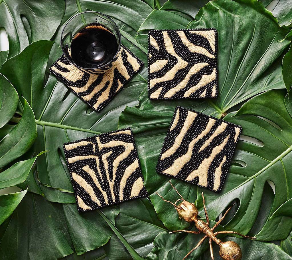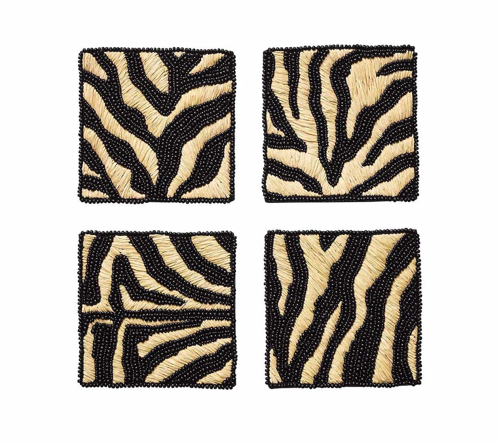 Kim Seybert's Serengeti Coasterswill take you on a walk to the wild side and add excitement to cocktail hour with friends. Raffia, glass and wooden beads are hand strung to create a realistic zebra pattern. 4.5" x 4.5" x 0.2". 50% Raffia, 30% Wood Beads, 20% Glass Beads On 100%Cotton Backing.