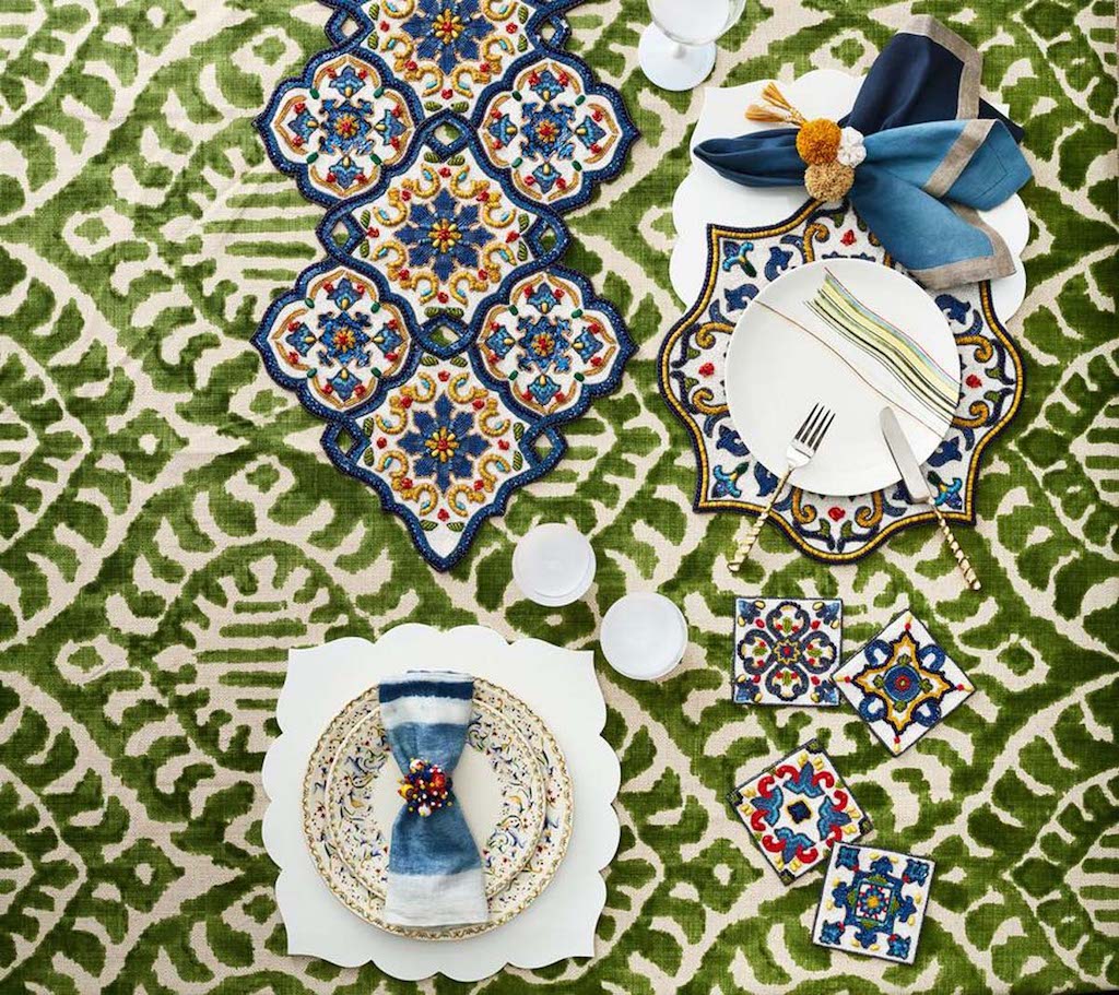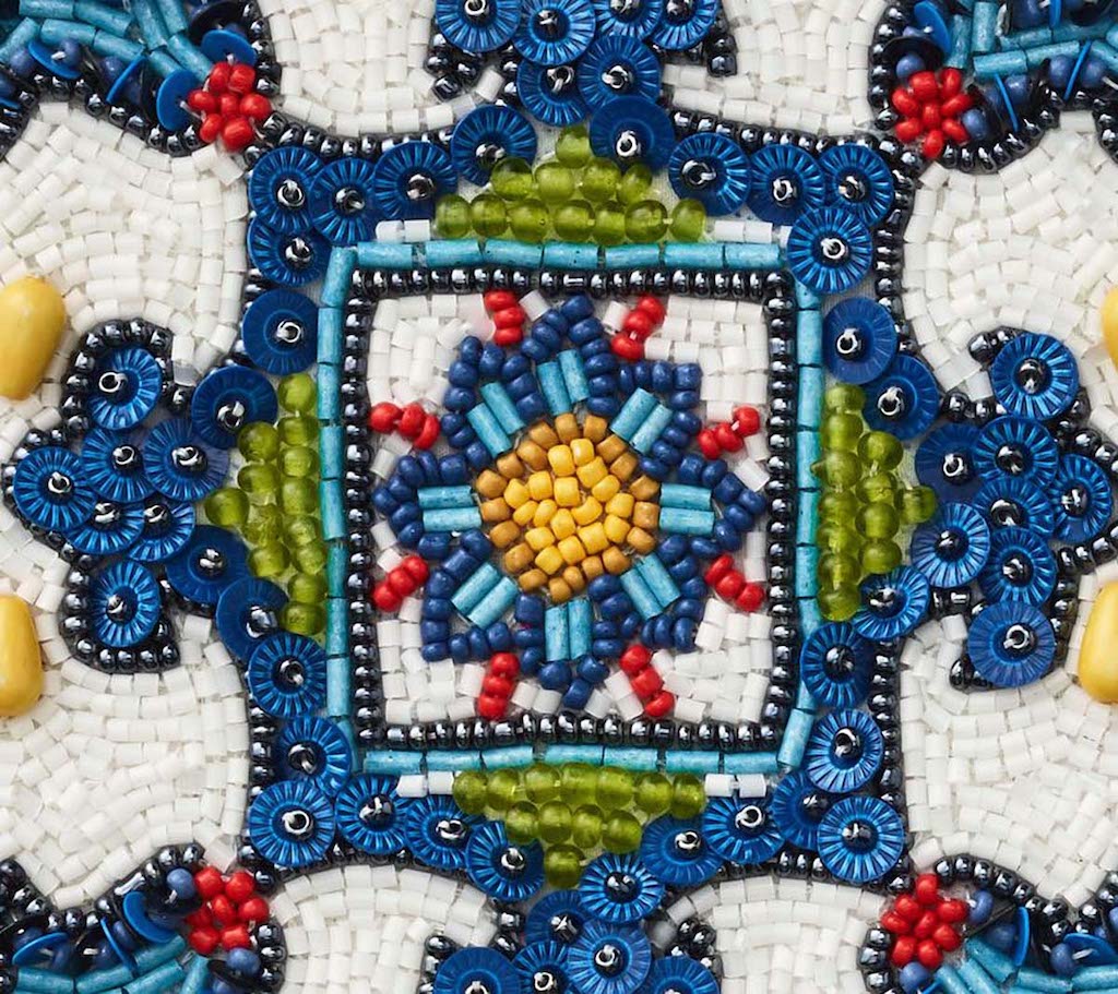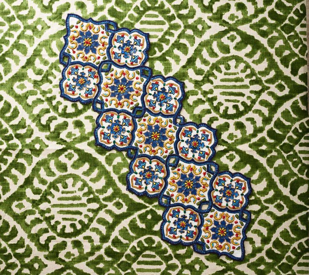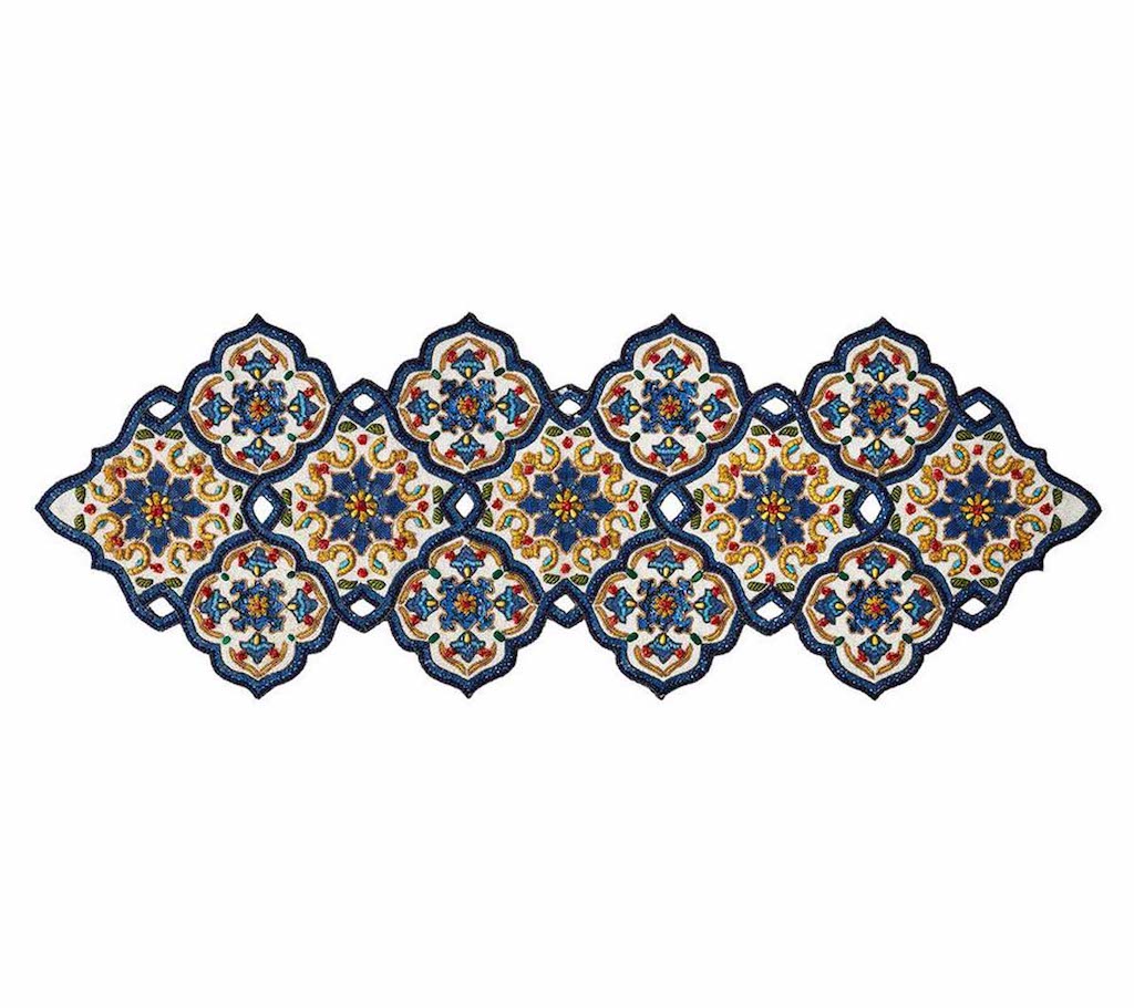 Kim Seybert's Seville Runner is in an arabesque shape in the Moorish influenced architecture of Seville and the colorful flamenco costumes inspired this beautiful runner. It is made completely from dyed glass beads and sequins coupled with cording techniques. It is ideal for festive occasions be they formal or relaxed. Works well with coordinating placemat, napkin ring and coaster set. 47" x 16.5" x 0.2". 55% glass beads, 35% plastic beads, 10% chip beads, 100% cotton backing.