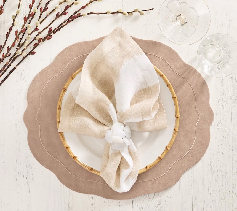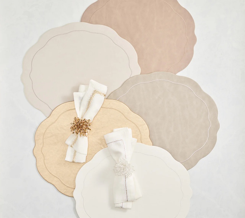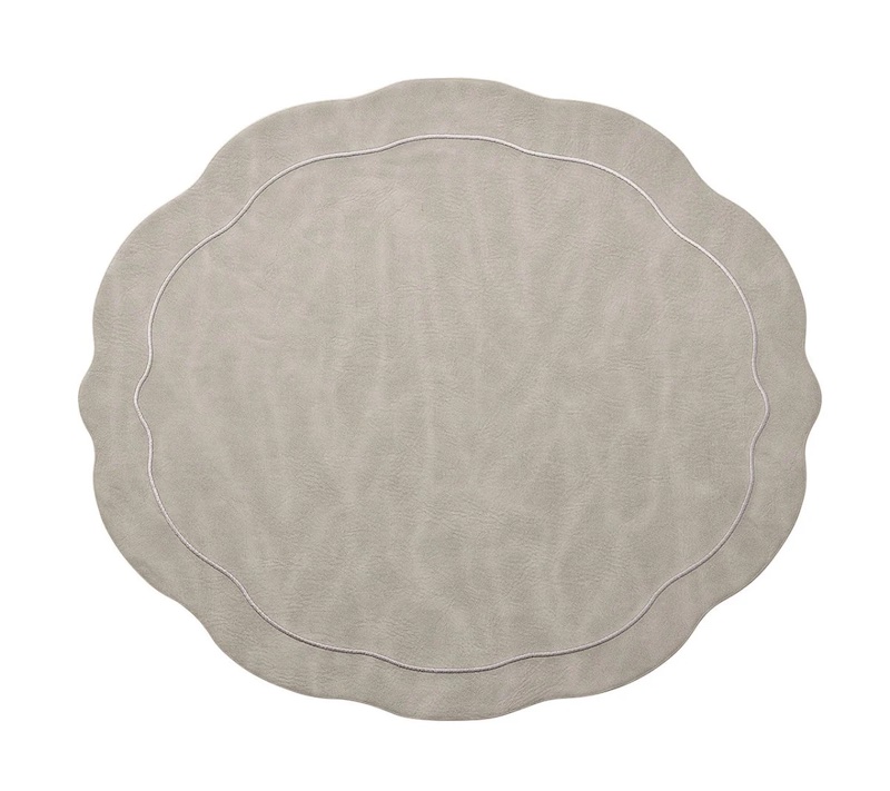 Kim Seybert's Tailored Placemats in Neutral Tones have a traditional oval shape with a modern refresh. A stylish wavy edge and embroidered tone-on-tone border detailing elevate this faux leather accessory. This hard-backed versatile placemat is available in a variety of colors. 100% Polyurethane with PVC Backing. 17.25" Length x 15" Width x 0.1" Height. Sets of Two.