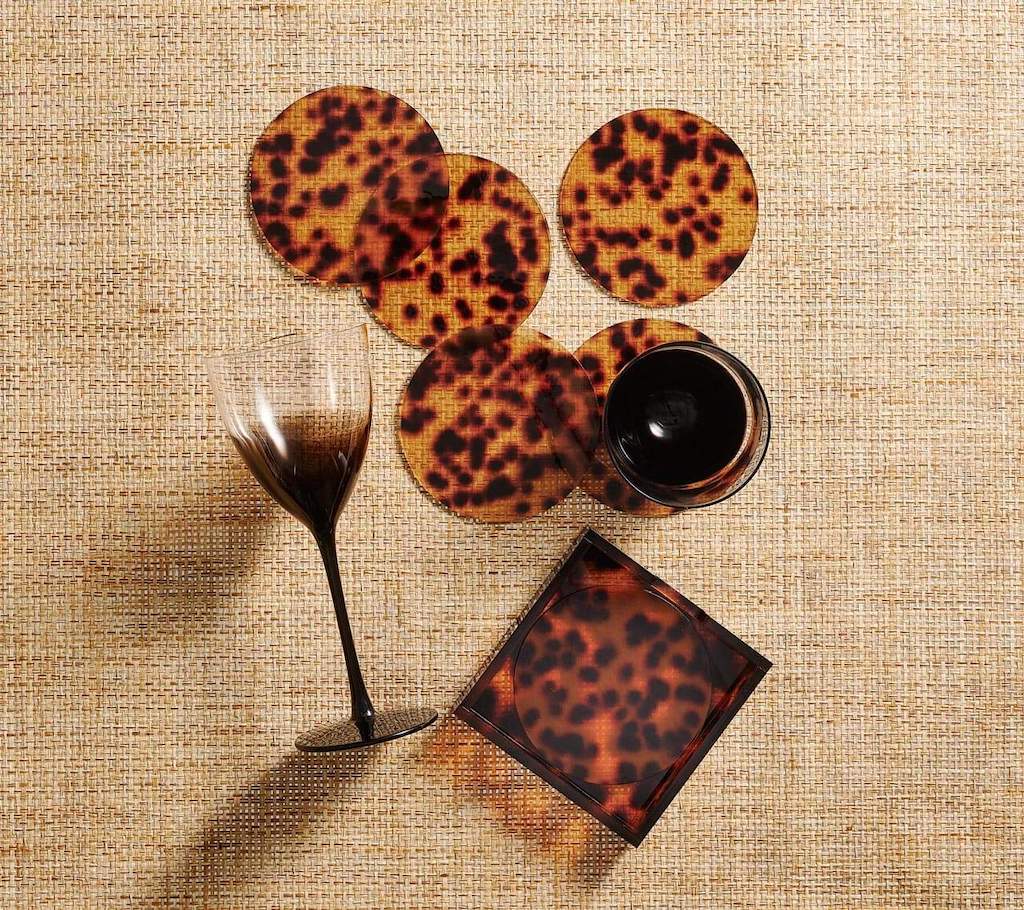 Kim Seybert's Tortoise Coasters are round and opulent. They are hand-poured resin to best represent authentic tortoise shell. The fall colors create an elegant setting fit for any table. Due to the organic nature of the tortoise pattern, these drink coasters may vary from one to another, a true representation of natural tortoise shell. Sold as a set of six in its own caddy. 100% Acrylic.