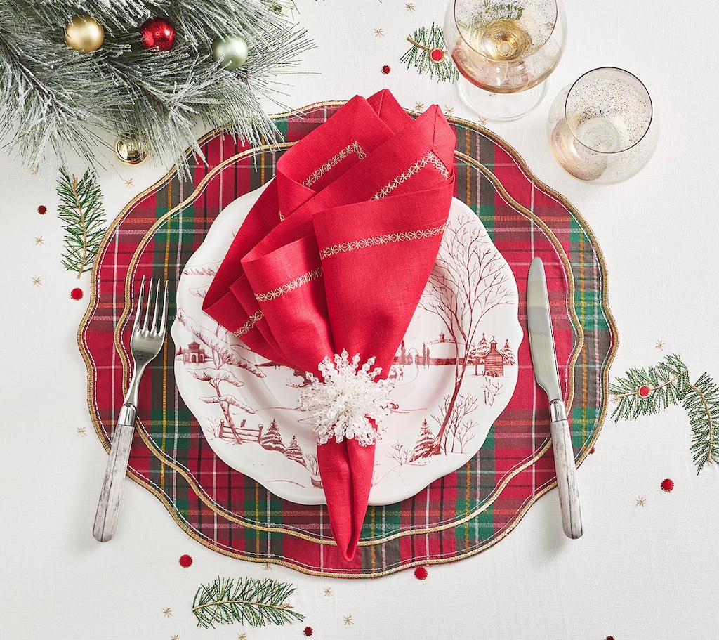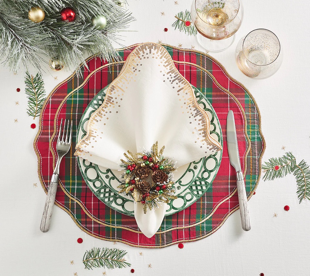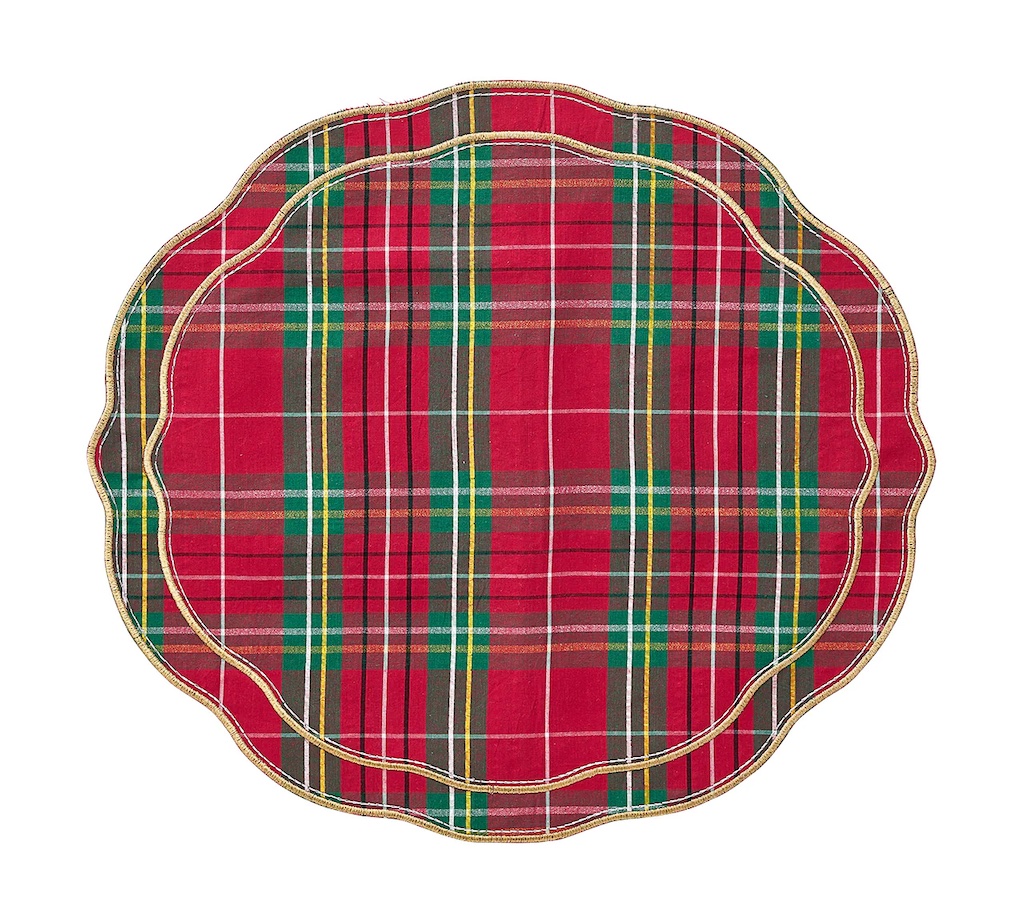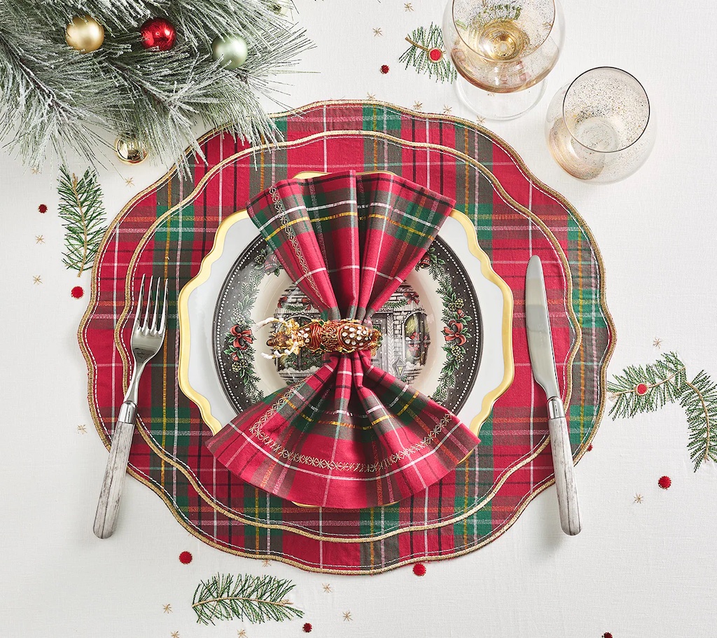 Kim Seybert's Traditional Plaid Placemat in Red, Green, and Gold has a Christmas motif and easy-care nature of this fabric placemat makes it an essential for holiday gatherings, from casual holiday lunches to formal Christmas dinners. The Trad Plaid Placemat embraces the season with its classic red and green tartan pattern and gold embroidered border. 17.25" Length x 15" Width x 0.1" Height. 100% Cotton.