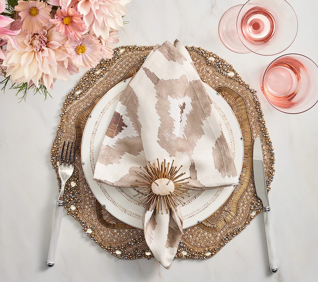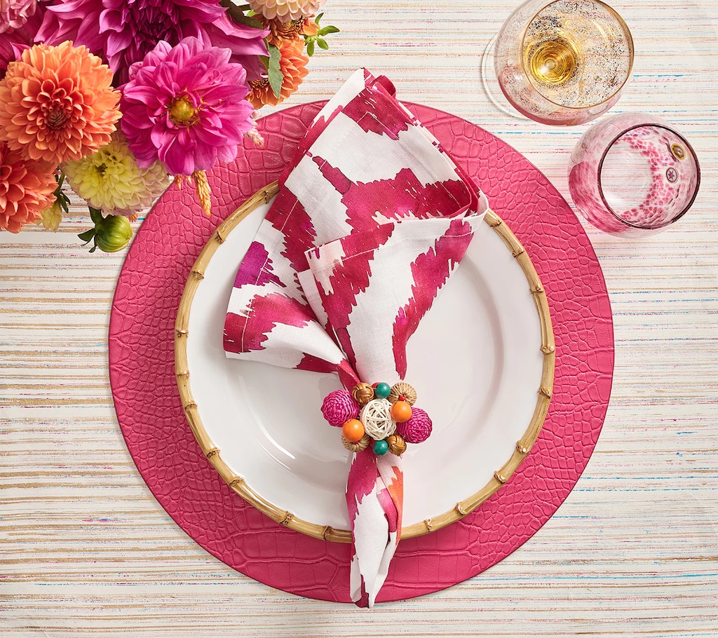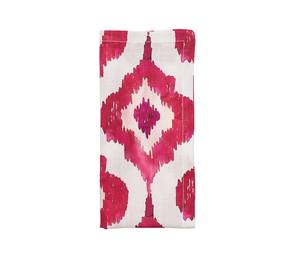 Kim Seybert's Watercolor Ikat Napkin presents a modern take on the traditional Indonesian Ikat. A hand-painted magnified section of a colored Ikat pattern is printed digitally on the linen, making these napkins a favorite among the style set. 100% Linen.