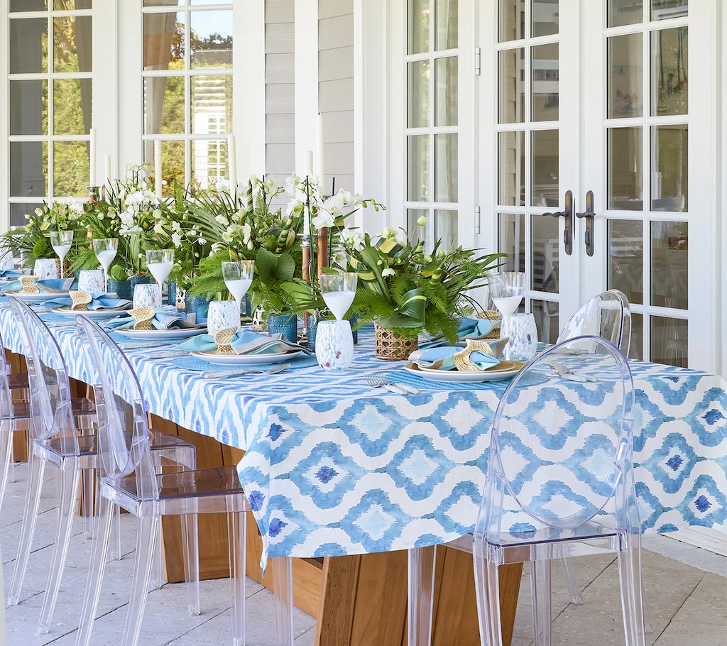 Kim Sybert's Watercolor Ikat Tablecloth in Blue is intricate and playful, the Watercolor Ikat Tablecloth was inspired by the Indonesian art of textile making by the same name. A hand-painted taupe Ikat pattern is printed digitally on the linen tablecloth and its intricate, playful pattern gives the table an instant sense of style. Available in matching napkins.