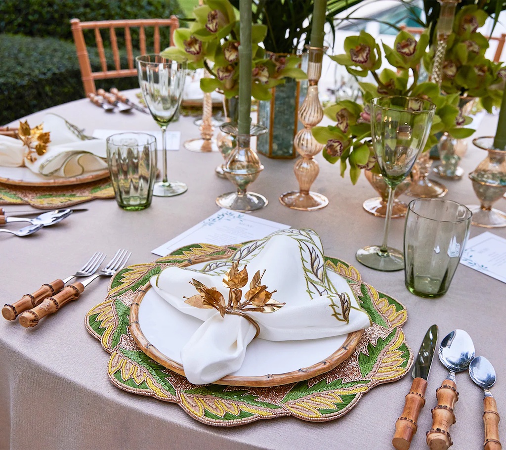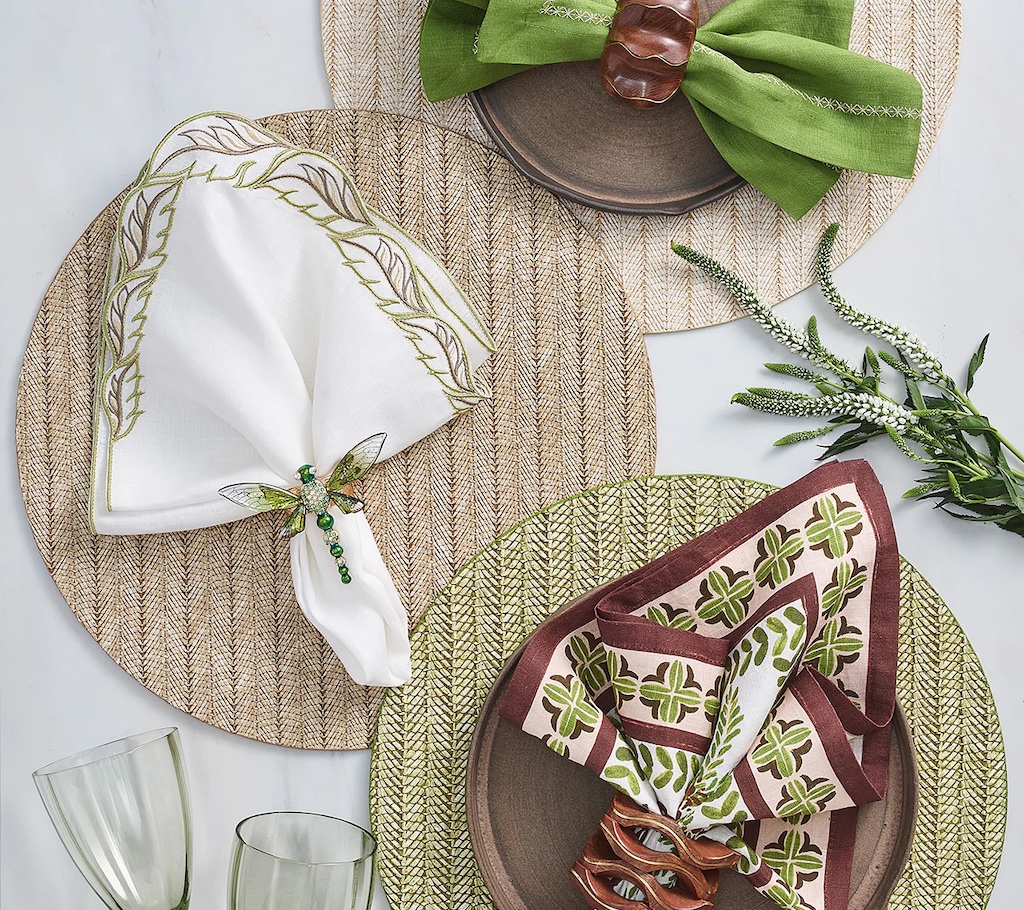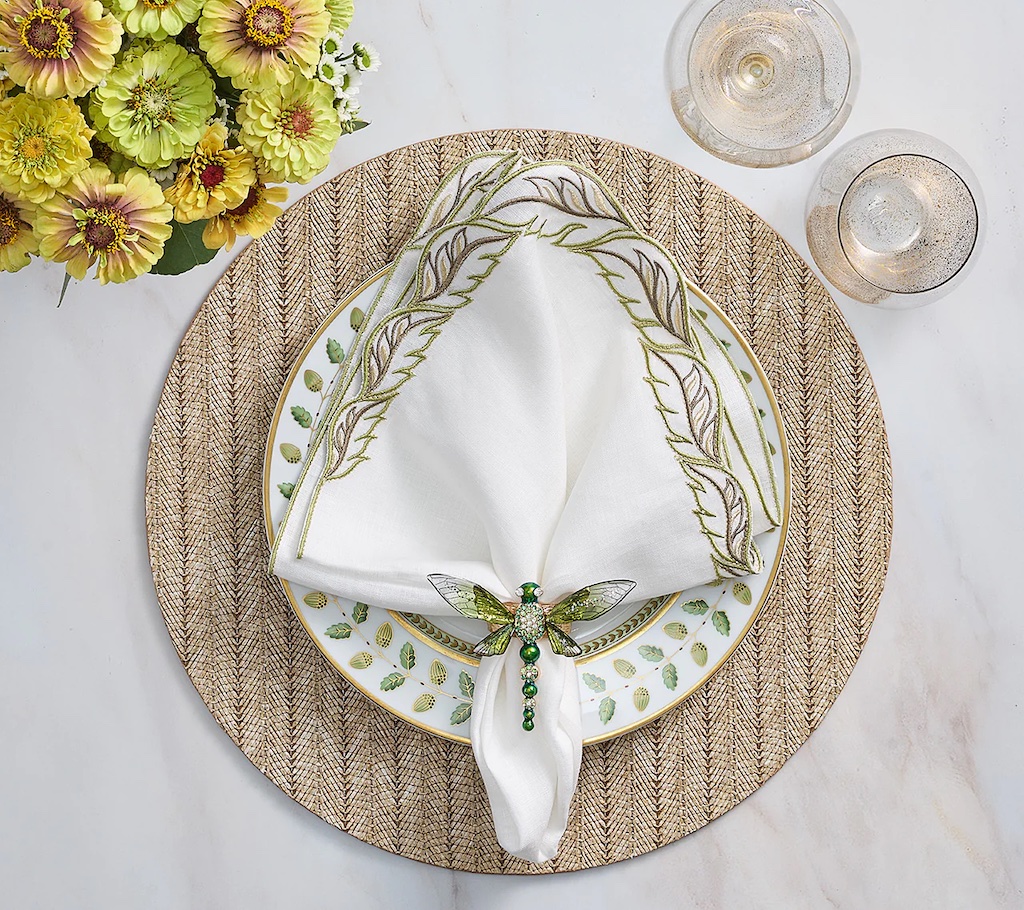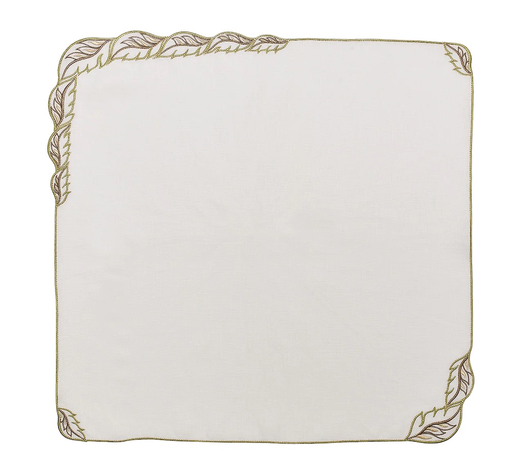 Kim Seybert's Winding Winding Vines Napkin in White & Green was was inspired by the idea of spring as a time of rebirth. The Winding Vines Napkin features a white linen base accented by natural-colored embroidered intertwined leaves with metallic veining, a design made to look like wind-blown leaves. Pair this napkin with the coordinating Winding Vines Placemat or other nature-inspired designs from Kim Seybert. 100% Linen.