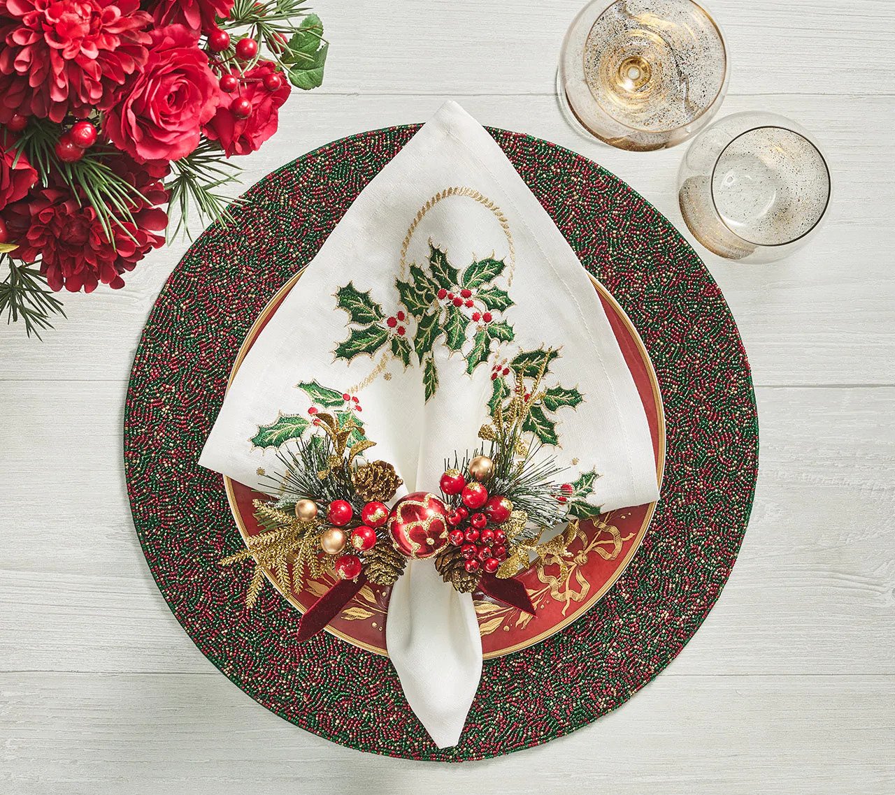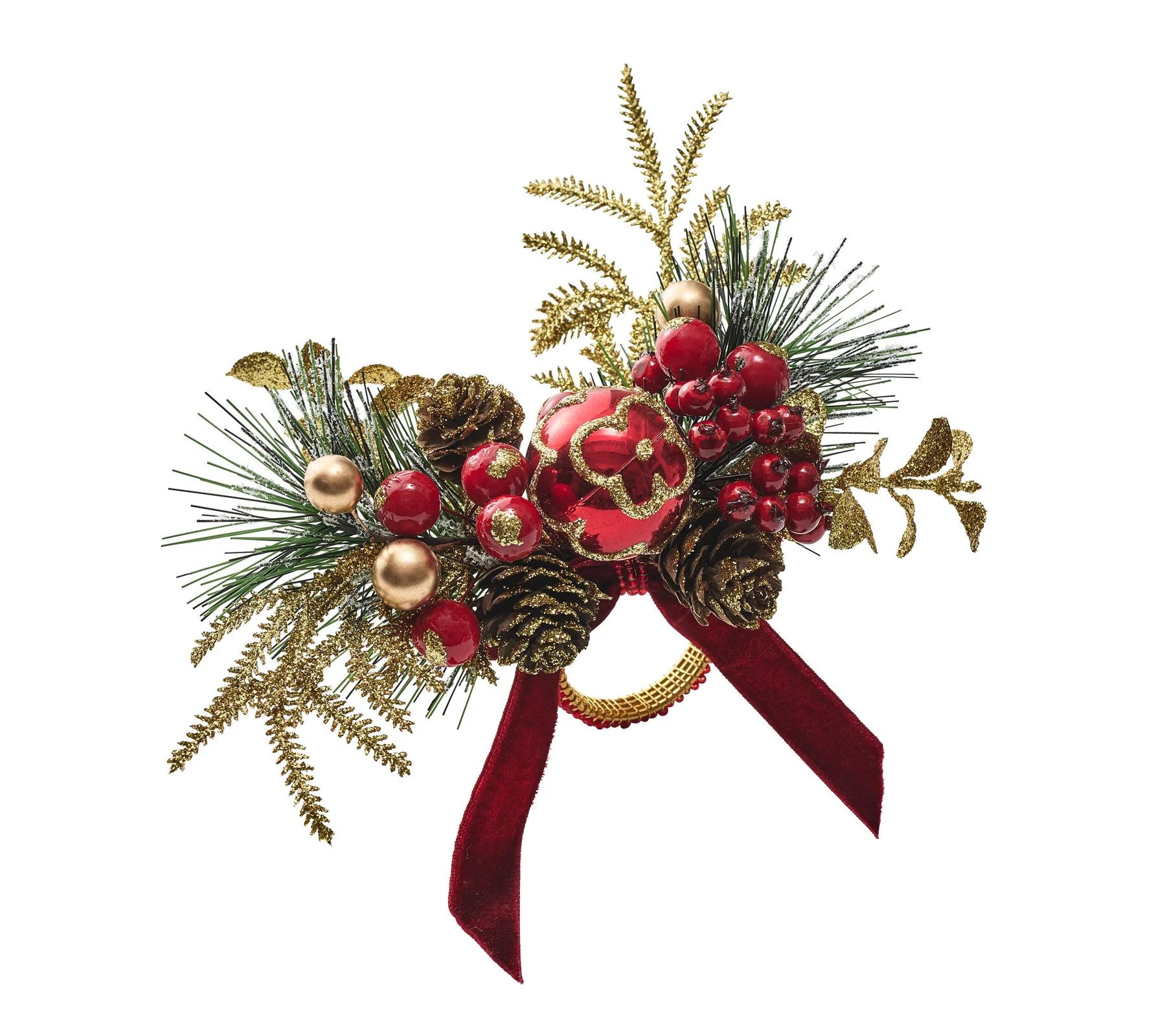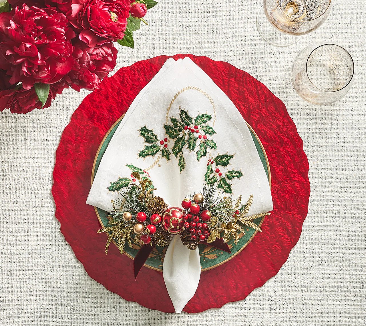 Kim Seybert's Xmas Cheer Napkin Rings will add a touch of joy and sparkle to your Holiday Table. Fashioned from pinecones, faux berries, and frosted branches, this Christmas mix is reminiscent of a wintery Christmas morning. Each napkin ring finished with a traditional velvet ribbon for added detailing. Last year's Xmas Tidings napkin ring sold out quickly -- we expect this to be gone soon.