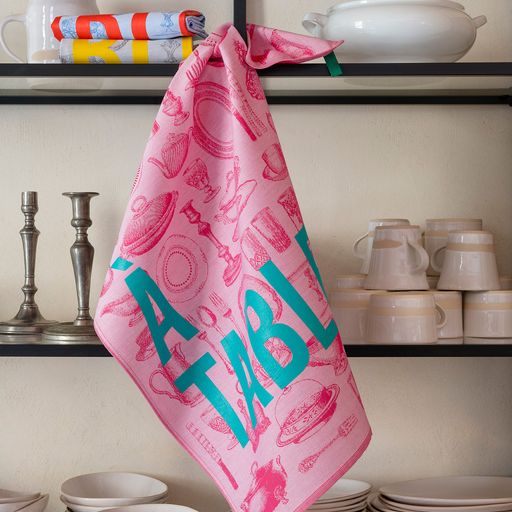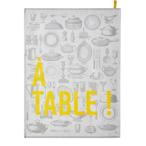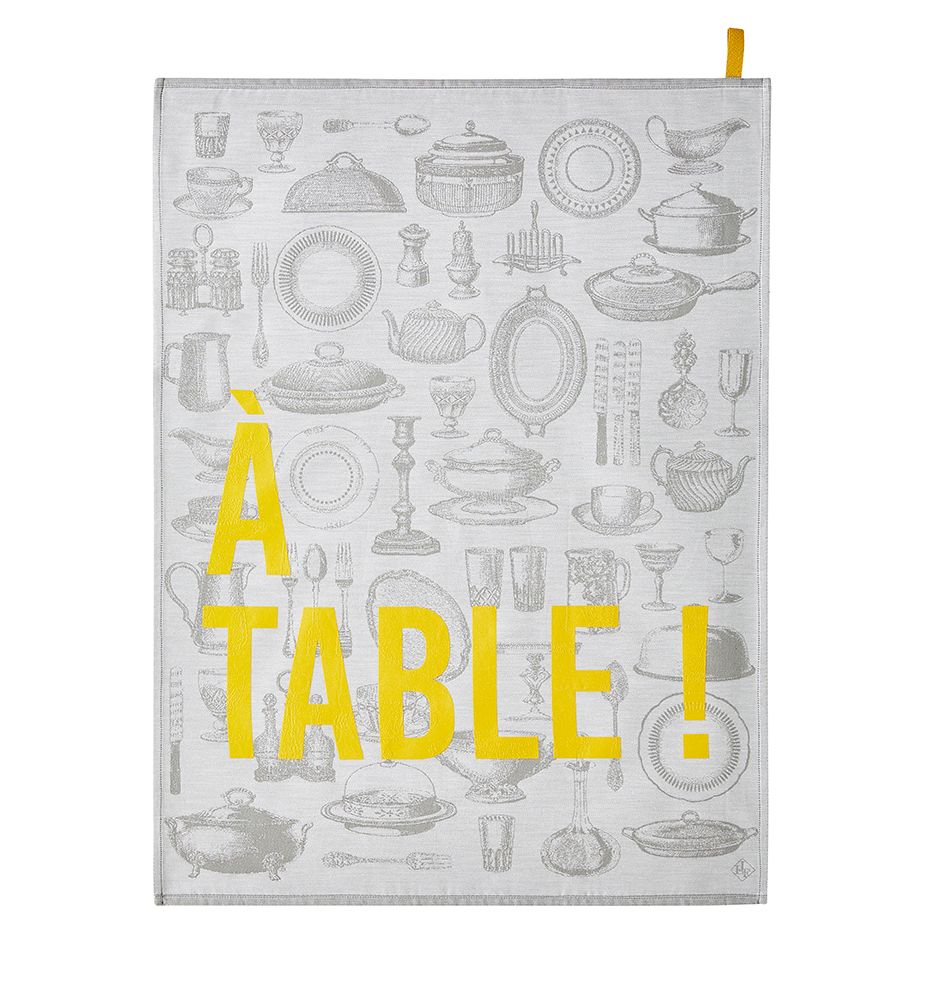 Le Jacquard Francais' A Table tea towel pays tribute to French heritage in an iconic style. A colorful silkscreen and braid bring a refreshing and contemporary look! You'll get a glamorous peak at some objets d'art for the table. The tea towel has a woven label to hang it easily in your kitchen. 100% long staple combed cotton. Available in three colors. France.