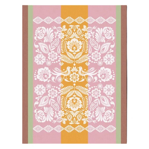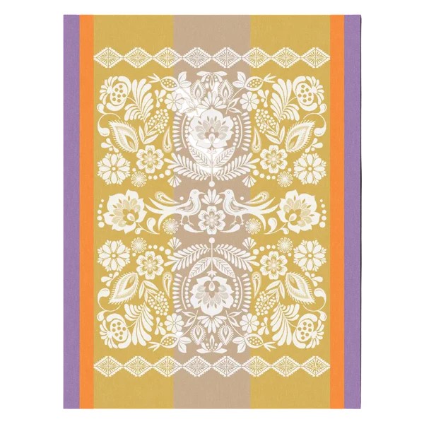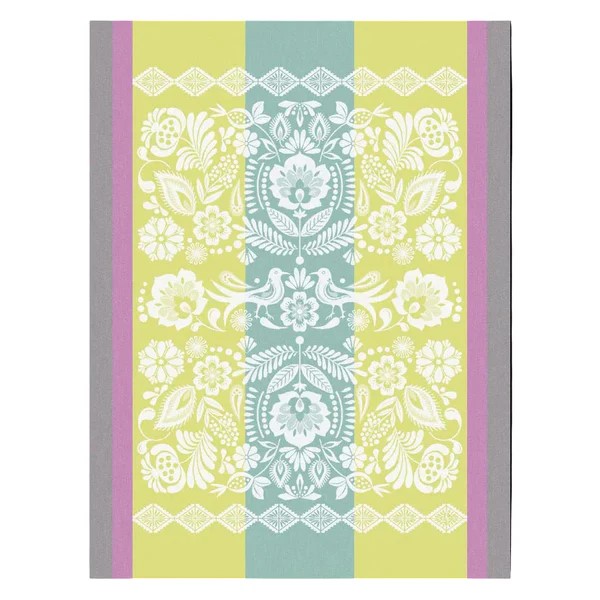 Le Jacquard Francais' Alegria Tea Towel celebrates nature's awakening with vibrant artistry inspired by traditional Tenango embroidery from Mexico. Feathers, flowers, and birds dance across the fabric in luminous colors that bring joy and energy to your kitchen. A statement piece that transforms everyday kitchen tasks into celebrations of color and craftsmanship.