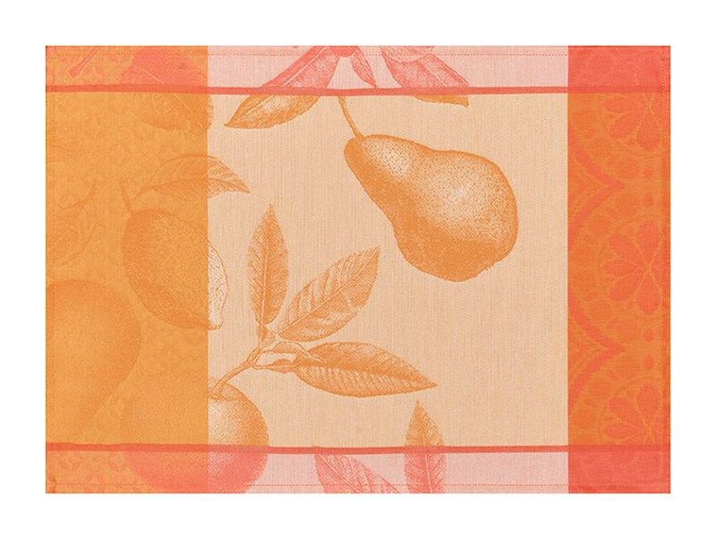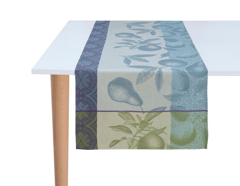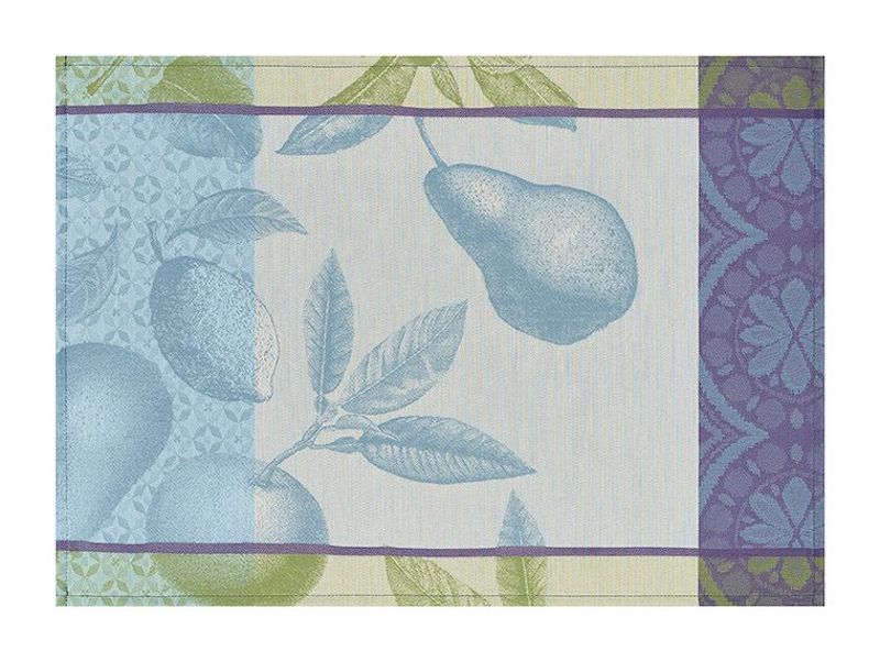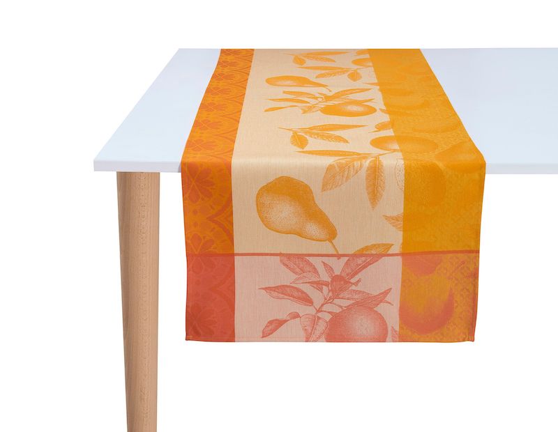 Le Jacquard Francais' Arriere Pays table linens are bountiful. The design consists of plump fruits and lively little creatures. The border resembles citrus fruits that have been cut open to reveal its pulpy sunshine. Available in three colors.