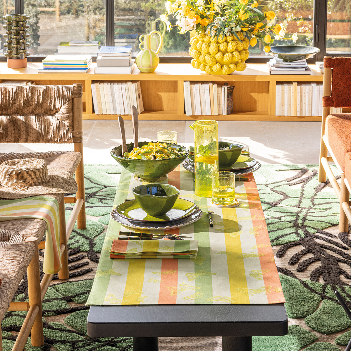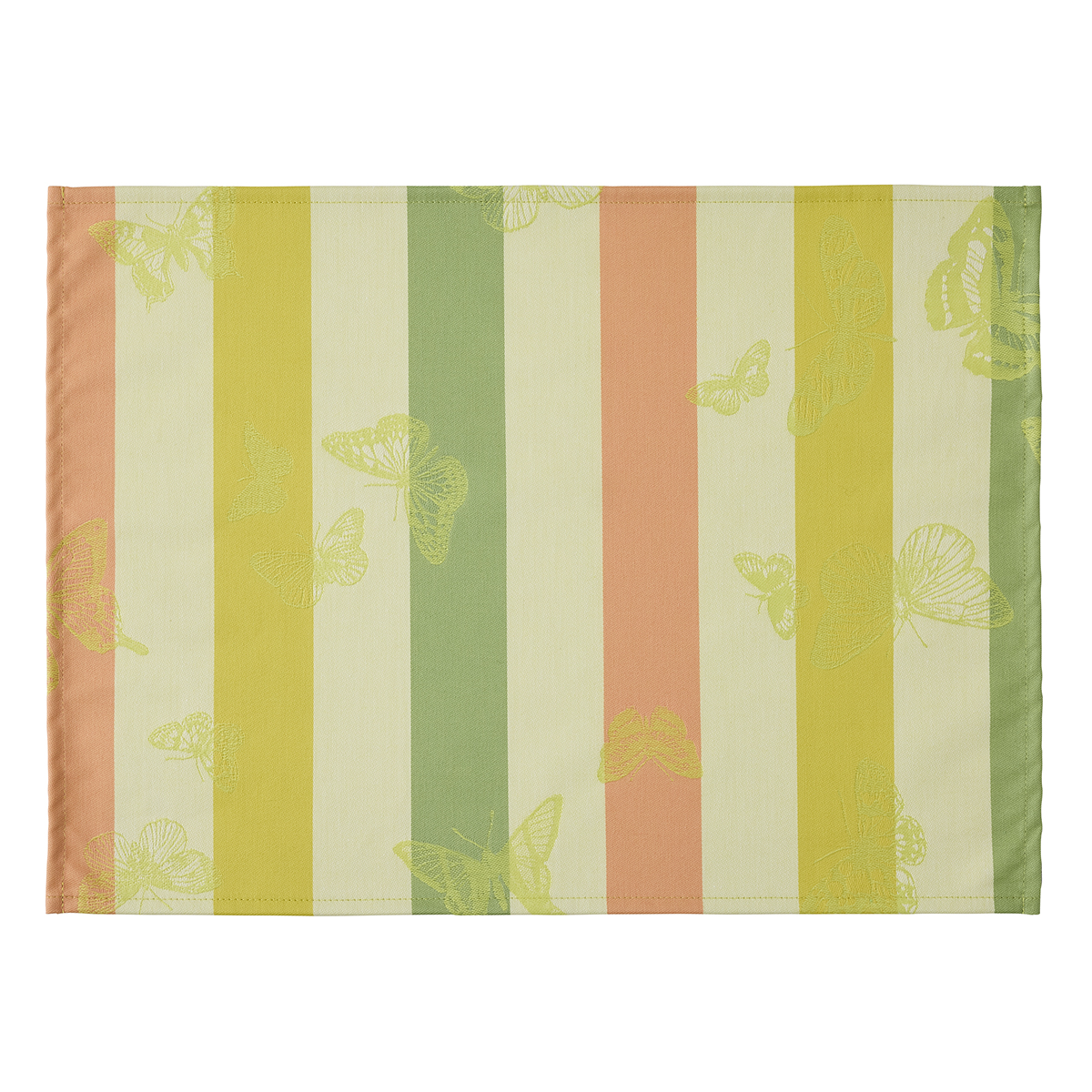 Le Jacquard Francais' Bal des Papillons coated table linen collection is enchanting and magical. The design has graceful butterflies and bold stripes. Available in three colors. Colored warp and weft. 100% cotton. Combed yarns, long fibers. Made in France.