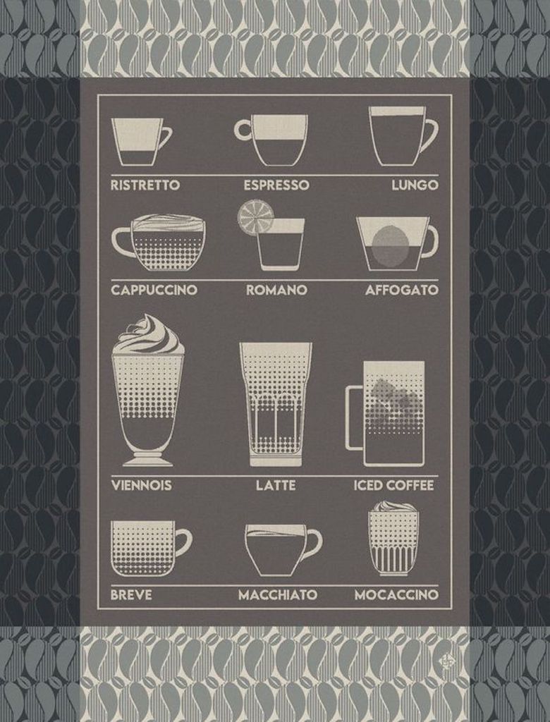 coffee lovers. The tea towel has all the well loved coffee beverages.