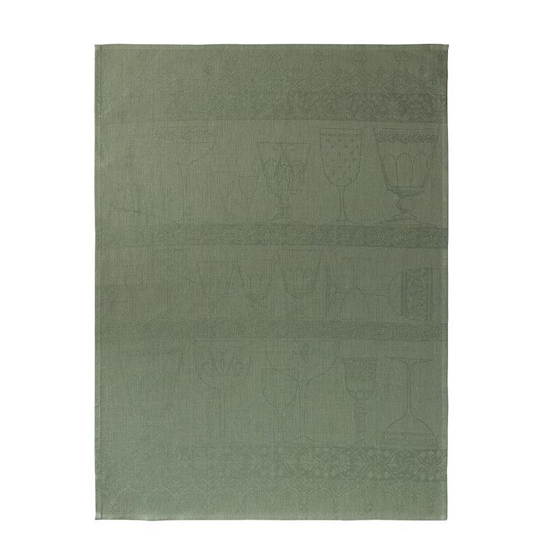 Le Jacquard Francais Cristal in Green Tea Towels are beautiful 100% linen tea towels. Cristal depicts an open cabinet with three shelves of etched wine glasses on it. Great for drying crystal and fine china. Jacquard woven from 100% Linen. Made in France.