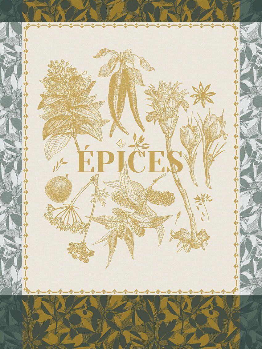 Le Jacquard Francais' Epices et Aromates tea towel highlights all the flavors of the world for a culinary whirlwind where ginger, chili, curry and coriander merge in total harmony! It is like going on a culinary tour without leaving your kitchen. The tea towel has a woven label to hang it easily in your kitchen. 100% long staple combed cotton. Available in three colors. France.