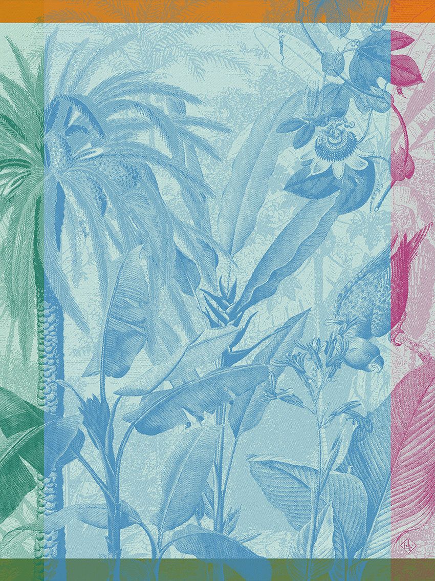 Le Jacquard Francais' Equateur tea towel will take you on a voyage to the rainforest for an unforgettable exotic journey in the heart of a panoramic landscape full of colors. The bright exotic patterns of banana trees, coconut palms, passionflowers and birds of paradise in this tea towel will be like sunshine in your kitchen. The tea towel has a woven label to hang it easily in your kitchen. 100% long staple combed cotton. Available in three colors. France.