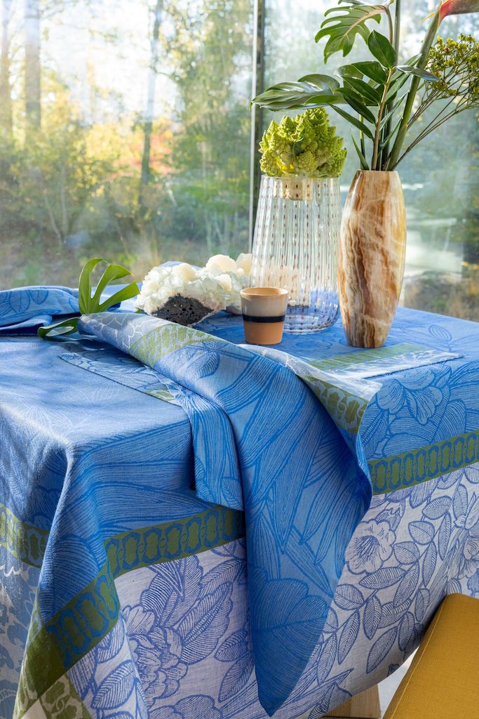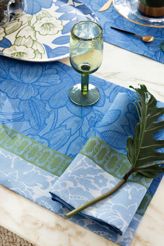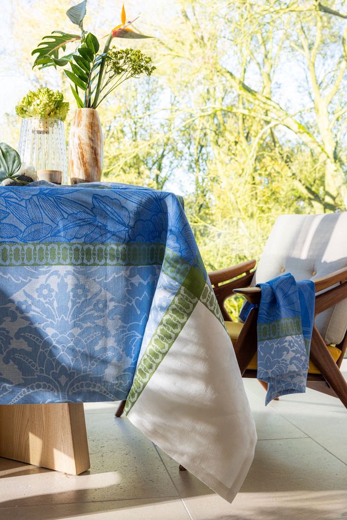 Le Jacquard Francais Escapade Tropicale is vibrant and ornate. The floral patterns and vibrant colors of this collection will captivate you for a joyful and refreshing getaway. This collection is an invitation to travel to distant lands with lush vegetation. 100% linen. Easy iron. France.