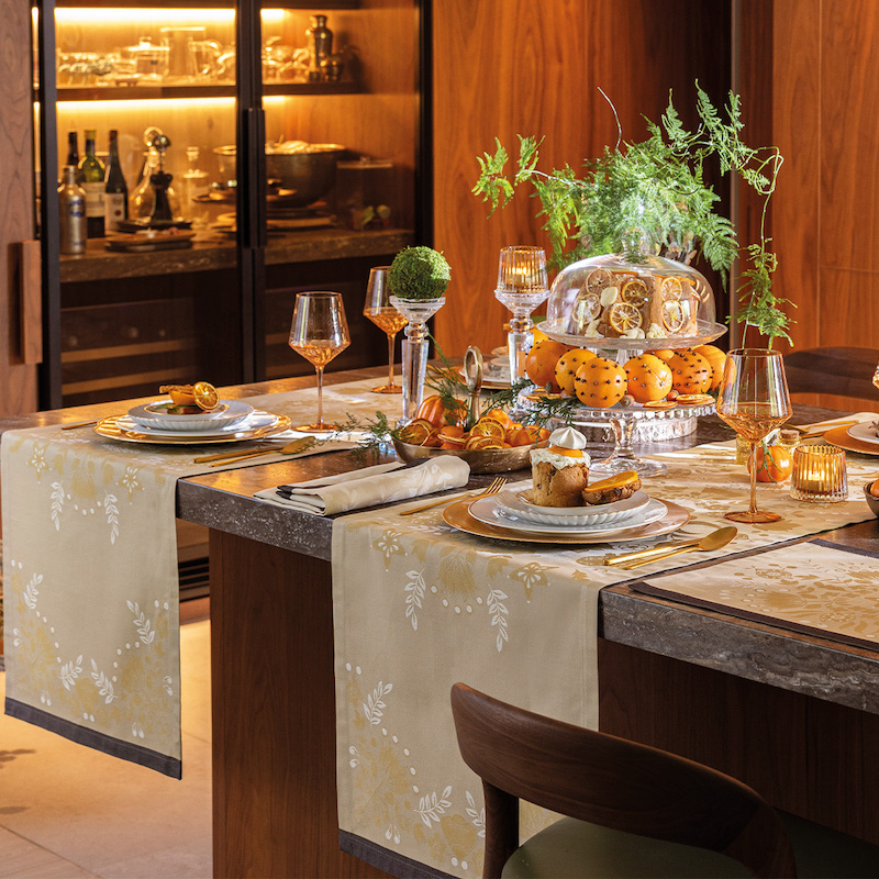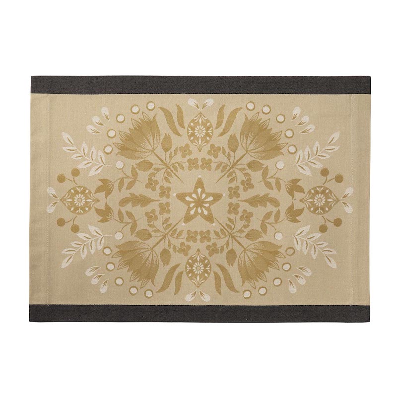 Le Jacquard Francais Feerie Table Linens in Yellow are pure folkloric magic. The design has garlands and wreaths made up of flowers that were inspired by traditional woodwork. They are so festive with their sparkling trees, stars, and ornaments. A perfect addition for your holiday table. 100% Cotton Combed Yarns (long fibers). Made in France.
