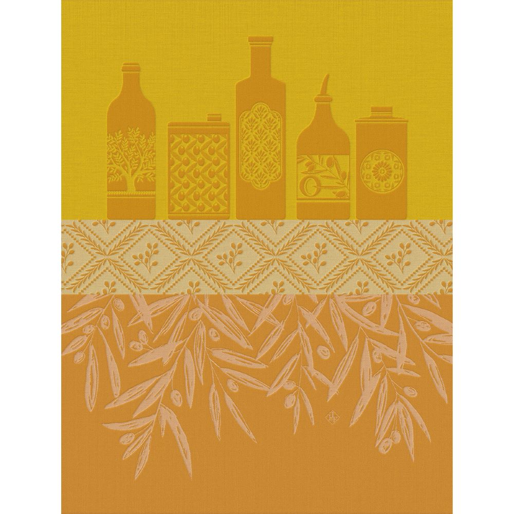Le Jacquard Francais' Huiles Provencal tea towel in Yellow is a gastronomic journey through a display of rustic and delicate oils of Provence.